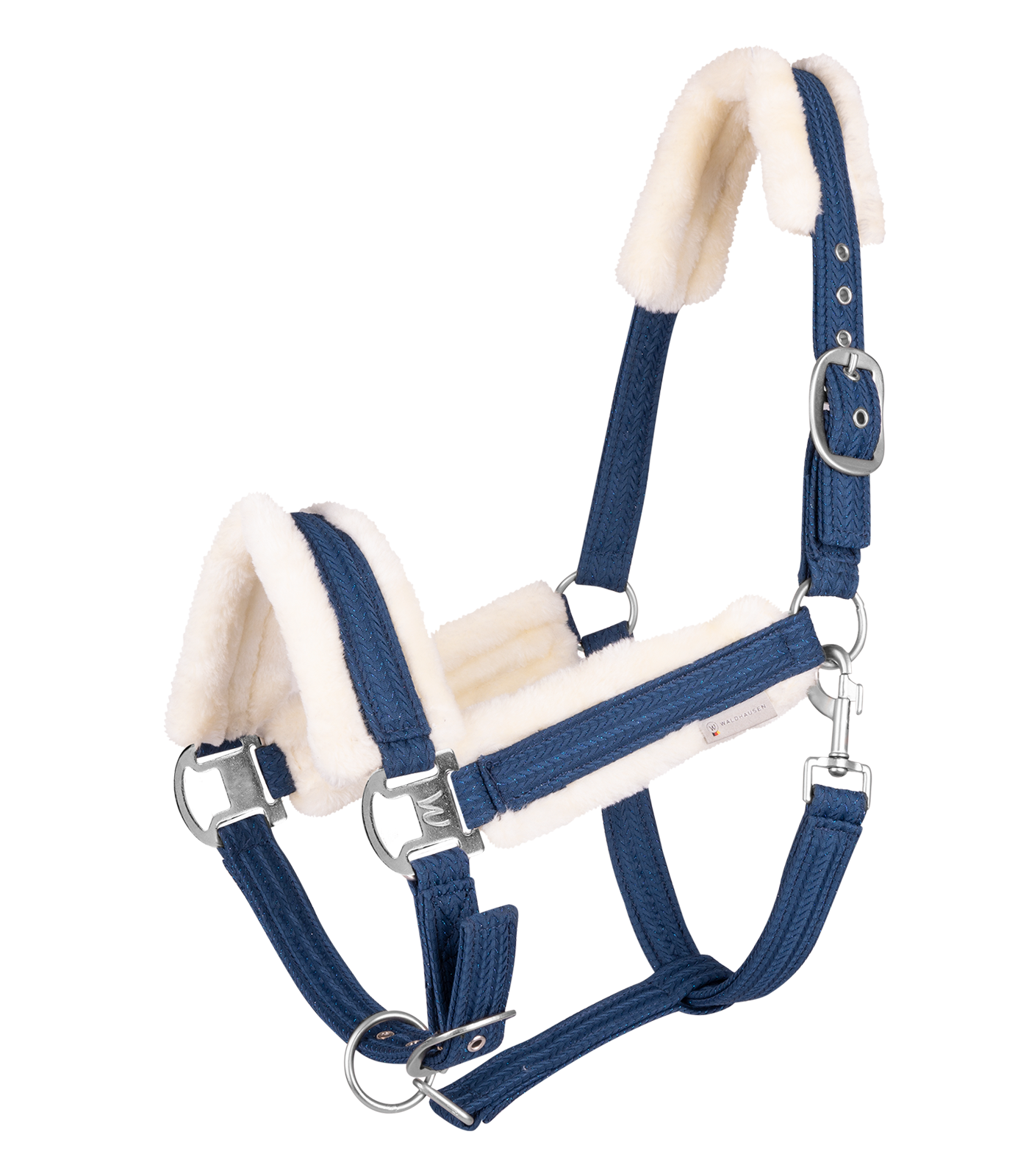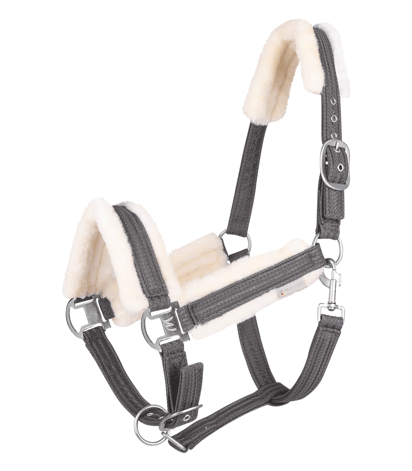 Fluffy halter with Waldhausen buckle. Multi-adjustable at chin strap and headpiece (on one side). Soft padding in synthetic fur on headpiece, noseband and cheekpieces.