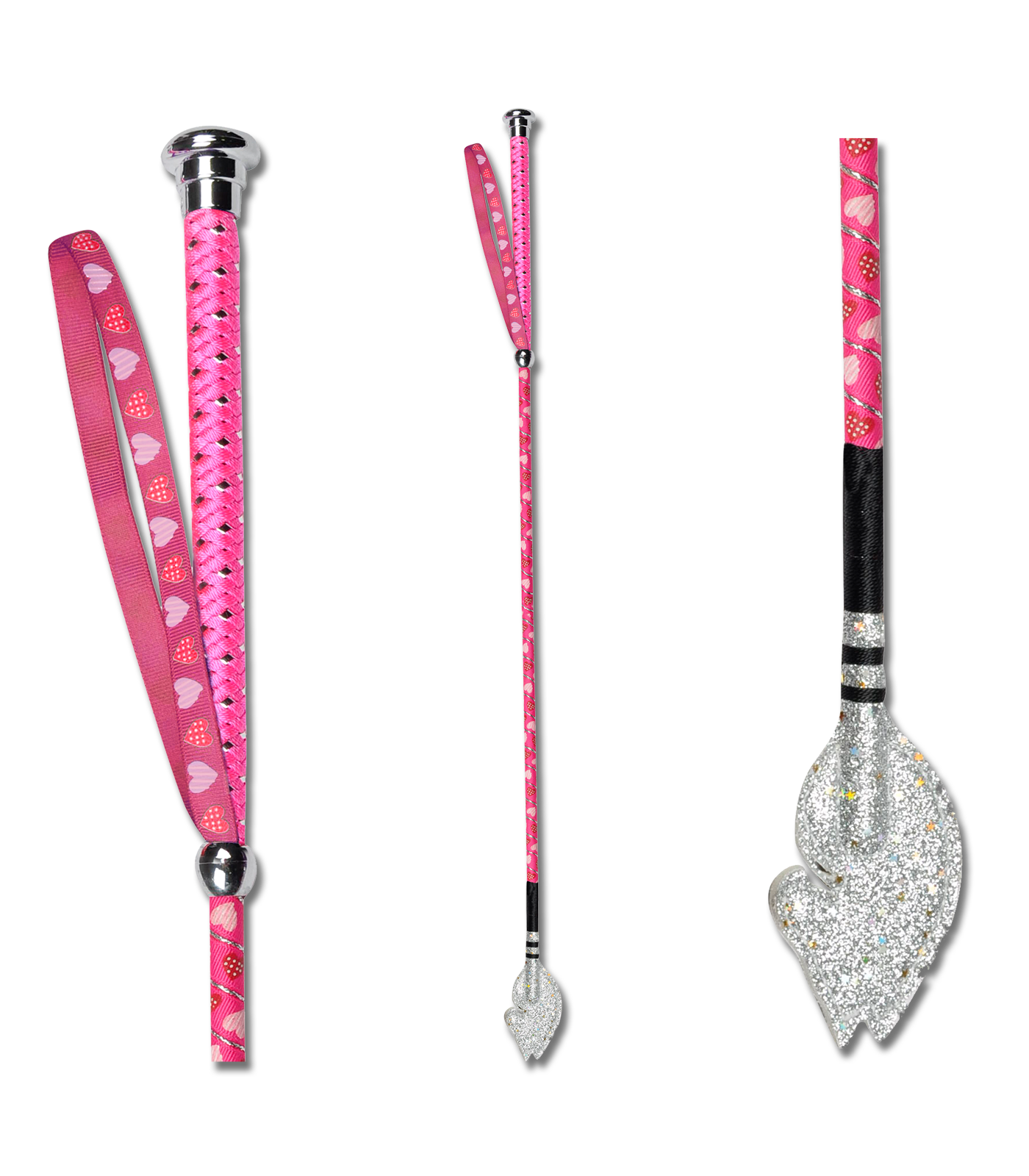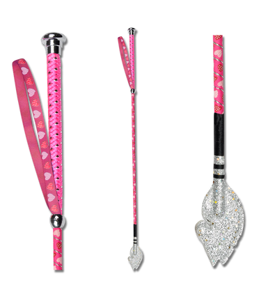 Beautiful child’s riding crop with elaborately wound nylon handle, nylon hand loop and a tongue with horse head motif.