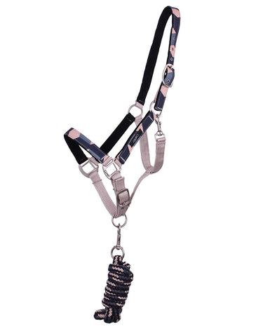Materiaal band: polyester, polypropeen Materiaal touw: polyester Materiaal fournituren: zink Luxe halsterset met patroon in een herbruikbare tas Op de bakstukken en neusriem gedecoreerd met een opvallend patroon Gesatineerde RVS fournituren met QHP ingeschreven Verstelbaar met een gesp bij de neusriem en het kopstuk Met musketonsluiting aan de keelriem Bijpassend driekleurig halstertouw Zacht onderlegd onder het kopstuk en de neusriem Geleverd in een handig plastic tasje met handvat en rits Onderdeel van de zomercollectie 2019