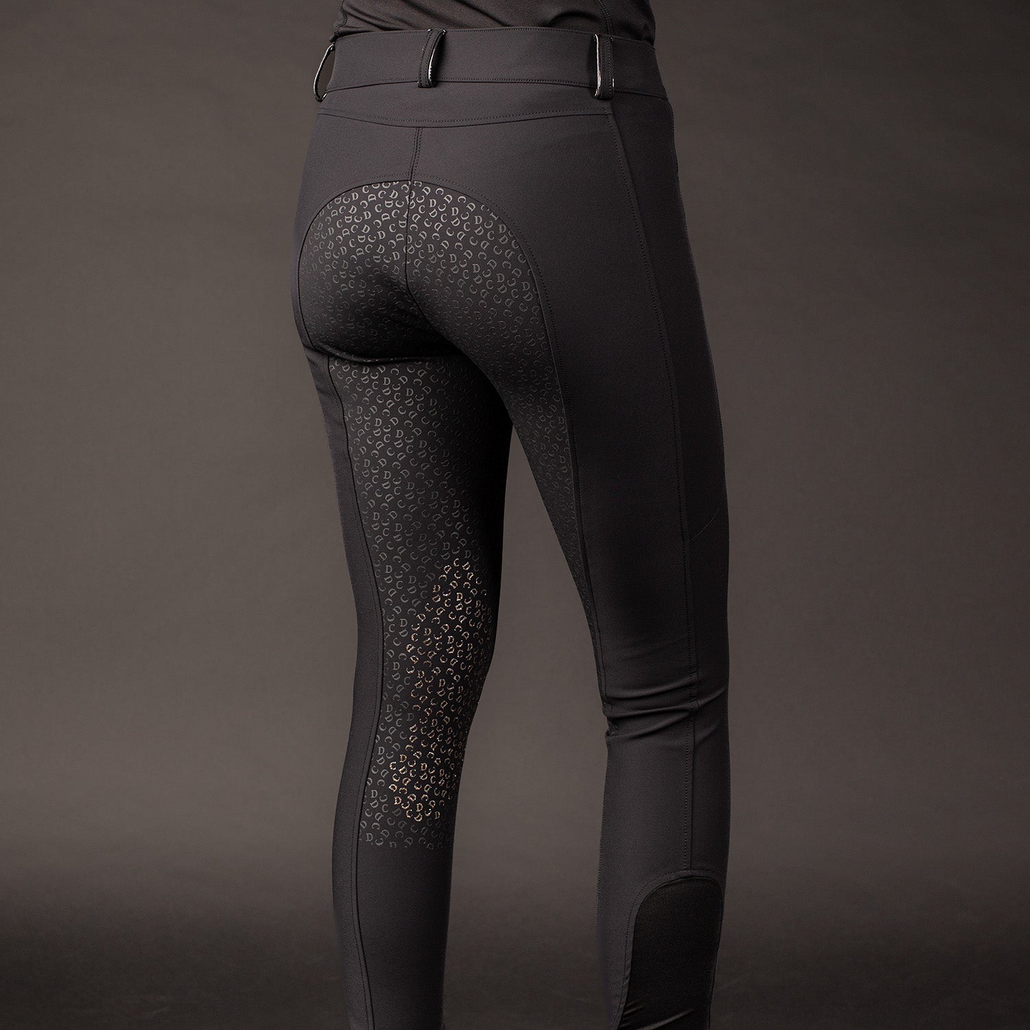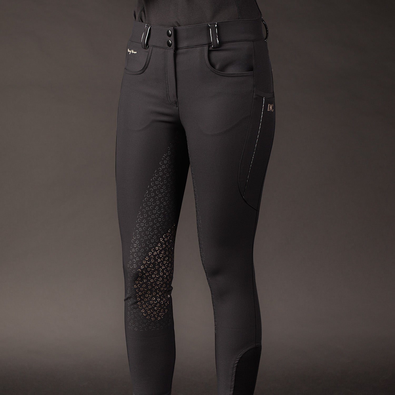 Rijbroek met riemlussen voorzien van een subtiele glitter piping, twee steekzakken, een telefoonzak aan de linkerkant met een glitter piping en een glitter siliconen Denici Cavalli logo, voorzien van een rondgenaaid zitvlak met siliconen print waarvan op de knieën met een subtiele glitter erin en een elastische inzet rond de enkel voor meer comfort in je paardrijlaarzen.