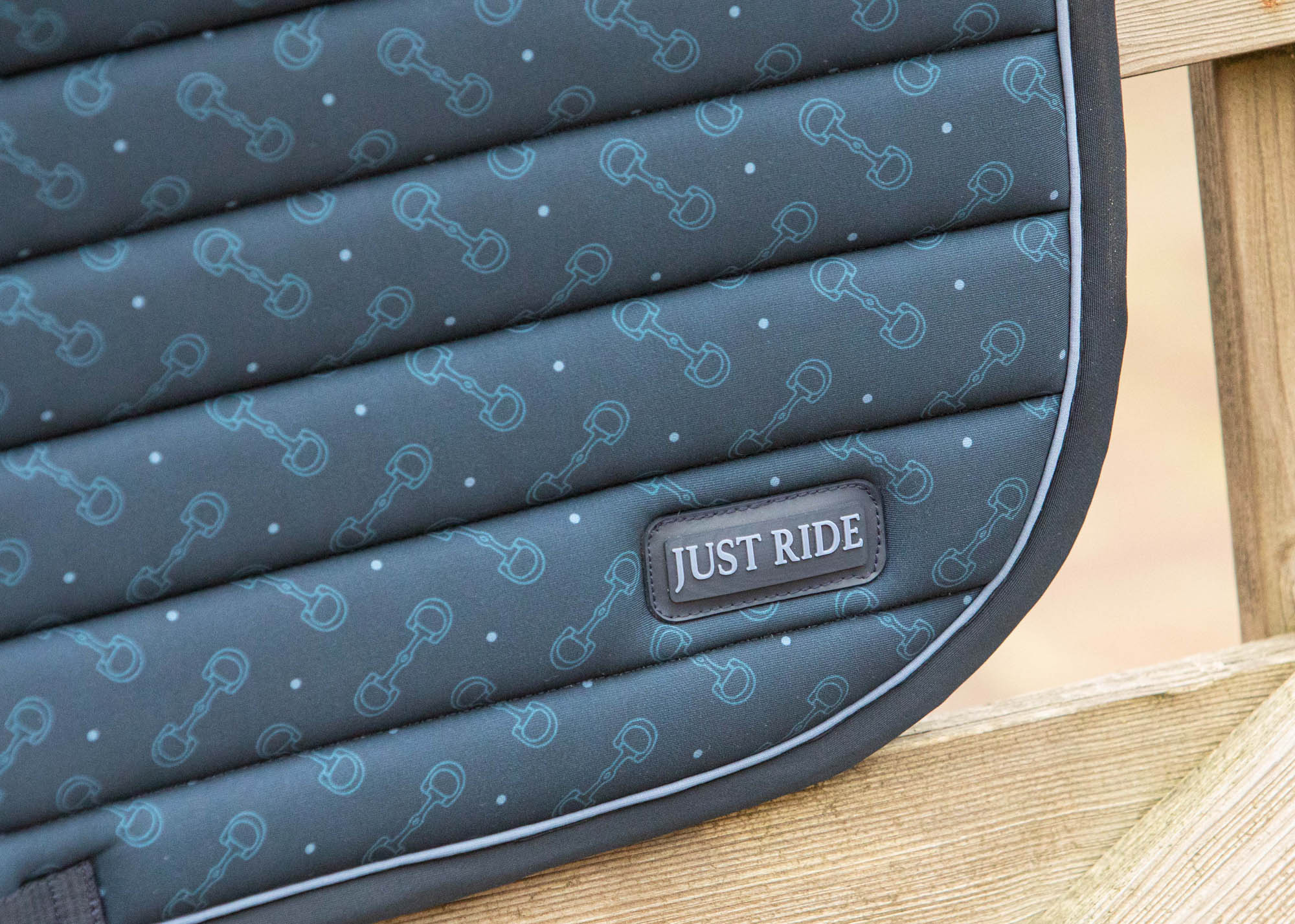 Zadeldek met horizontale quilt, een contrasterende sierbies, een overall print, zadel- en singellussen en een sneldrogende en ademende coolmesh voering.