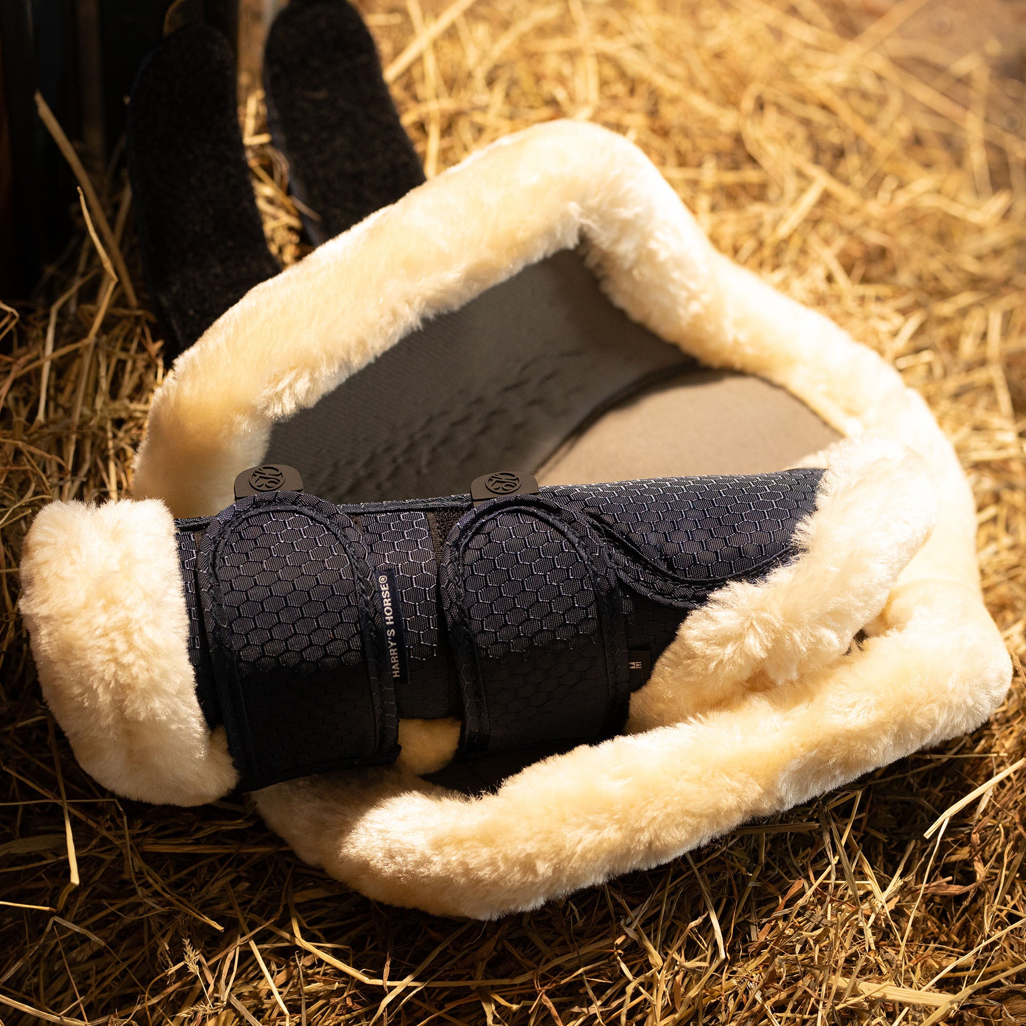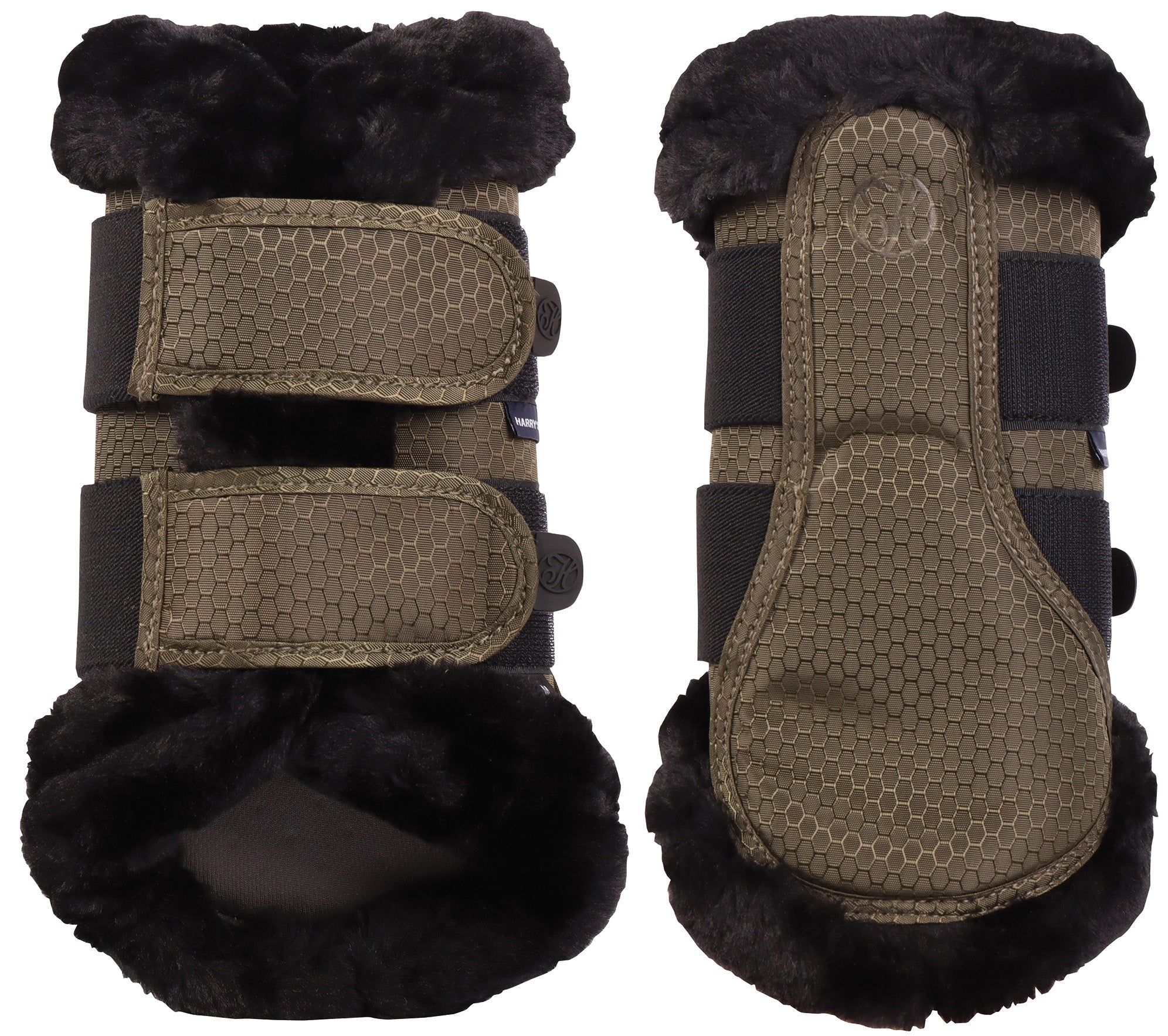 Beenbeschermers met elastische klittenbandsluiting. De binnenzijde is met mesh gevoerd voor een goede afvoer van de hitte en met een kunstbont sierrand voor een luxe uitstraling. Door de optimale pasvorm heeft het paard veel bewegingsvrijheid. De beschermers kunnen in de wasmachine op 30 graden gewassen worden.