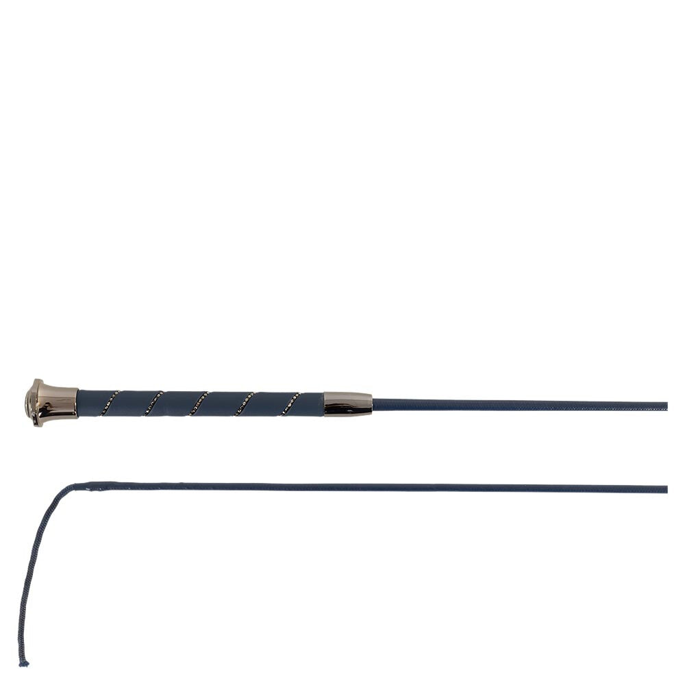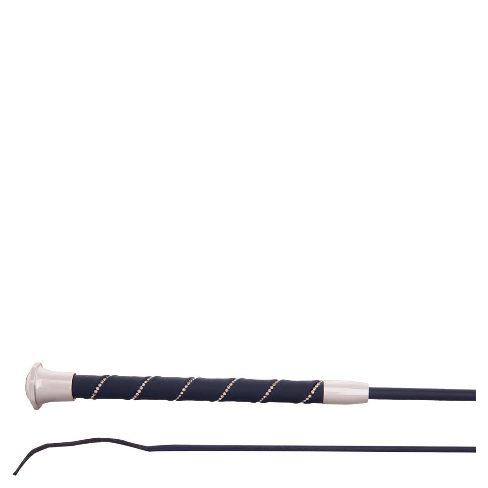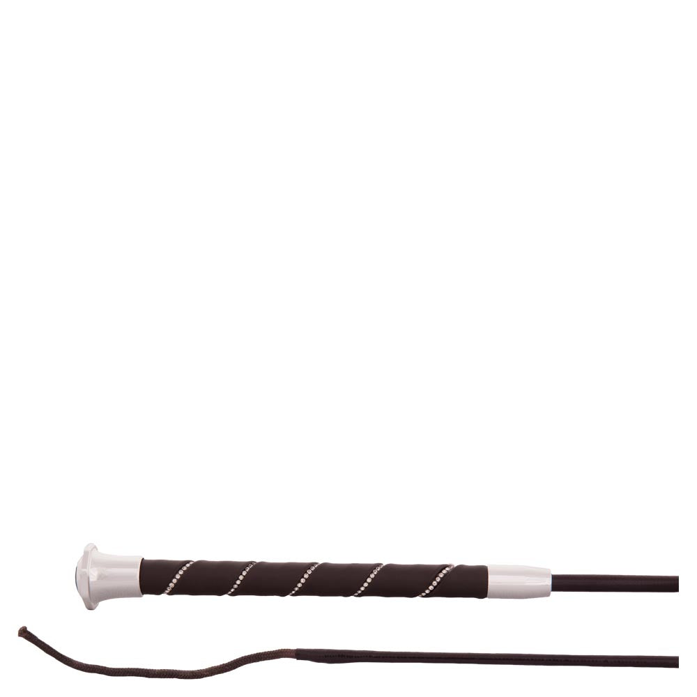 Dressuurzweep met een fiberglas kern en een zwarte stok. De speciale coating zorgt voor een lichte glans en langere levensduur. Ook het klapkoordje (10 cm) is door de verstevigende coating extra duurzaam. De zweep heeft een lederen handgreep met imitatiediamanten en een luxe zilverkleurige knop.