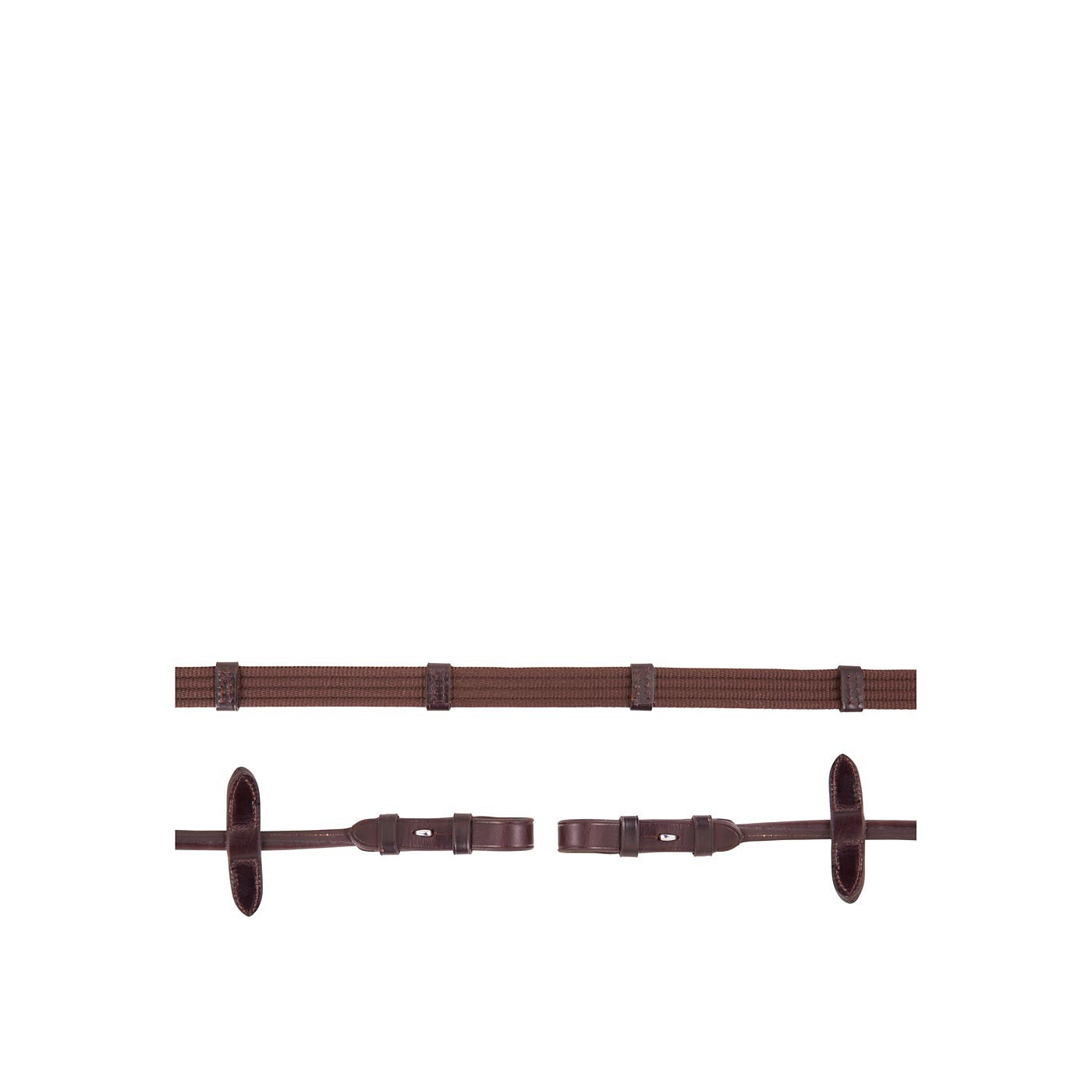 Linnen teugel met rondgenaaide uiteinden, hand- en teugelstops, blinde sluitingen en een ronde gesp, 19 mm.