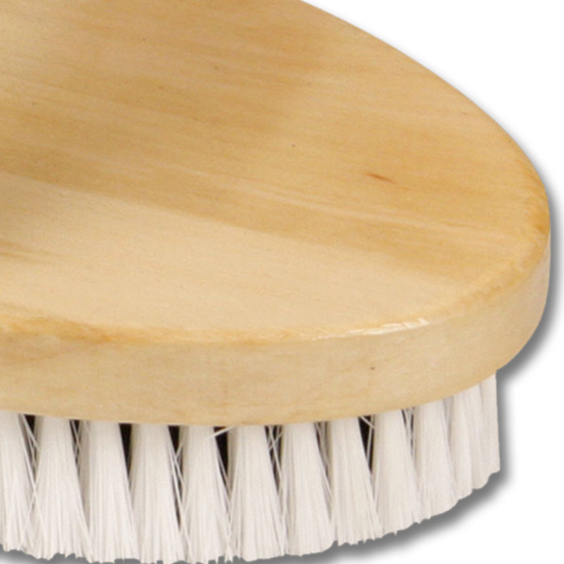 Medium-thick synthetic bristles in a black and white look, set in natural wood backing.