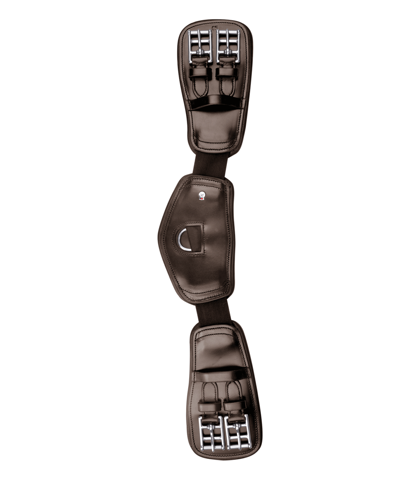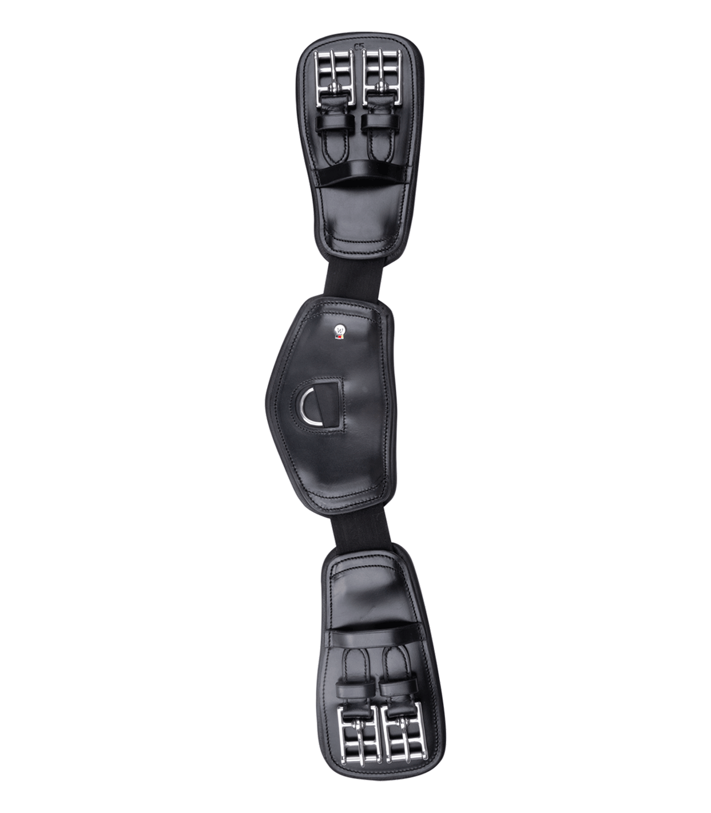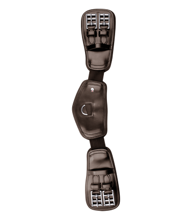 Softly padded, anatomically shaped girth made of high-quality leather. The two elasticated inserts provide extra freedom of movement while breathing and counteract belt tension. The three leather parts are softly padded and offer excellent pressure distribution thanks to their large contact surface. Without elasticated strap ends, with stainless steel roller buckles and D-ring.
