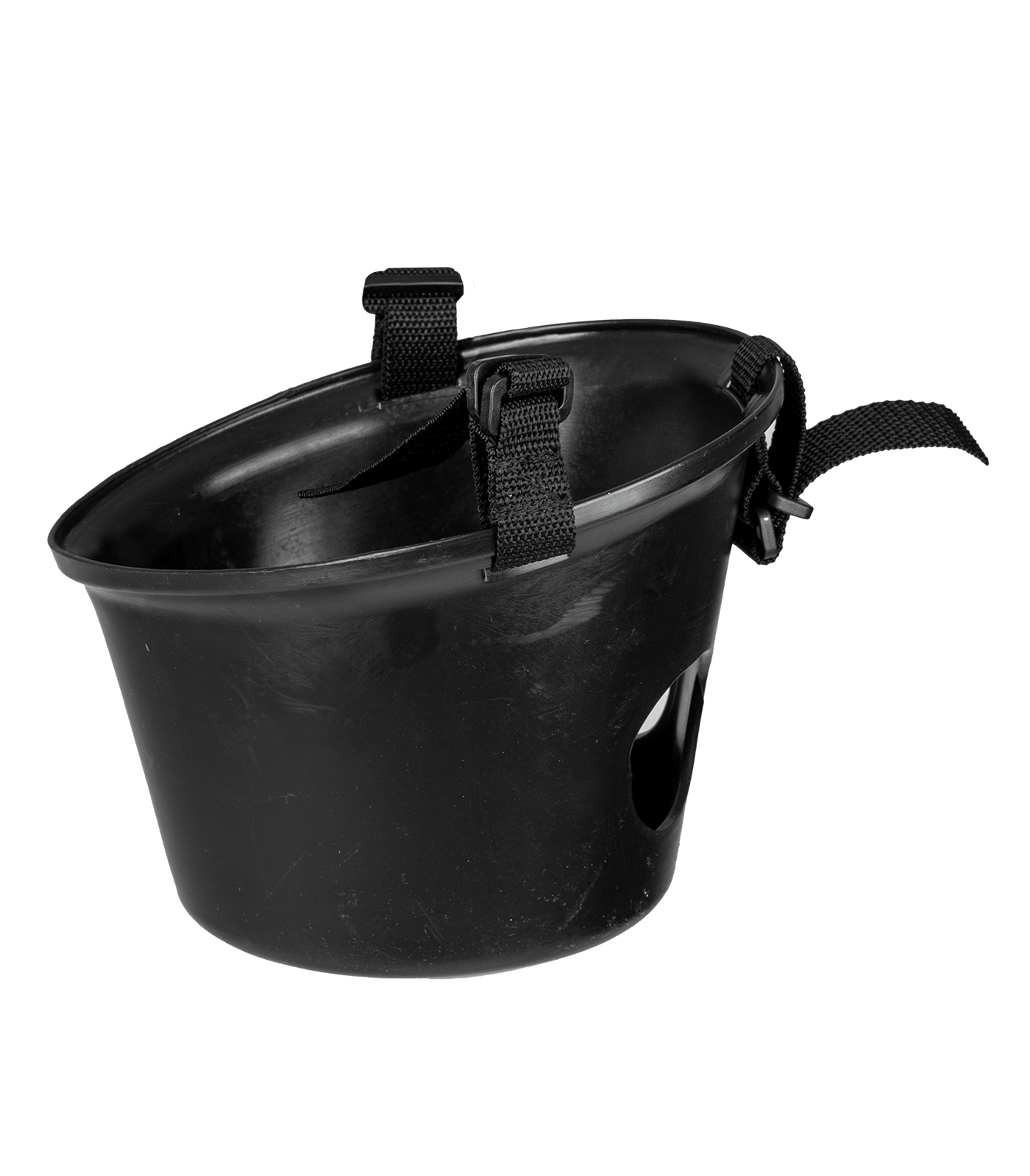 Robust, rinseable plastic muzzle with steplessly adjustable nylon head strap. (FOAL Size to be attached to the halter). With vents for unrestricted breathing.