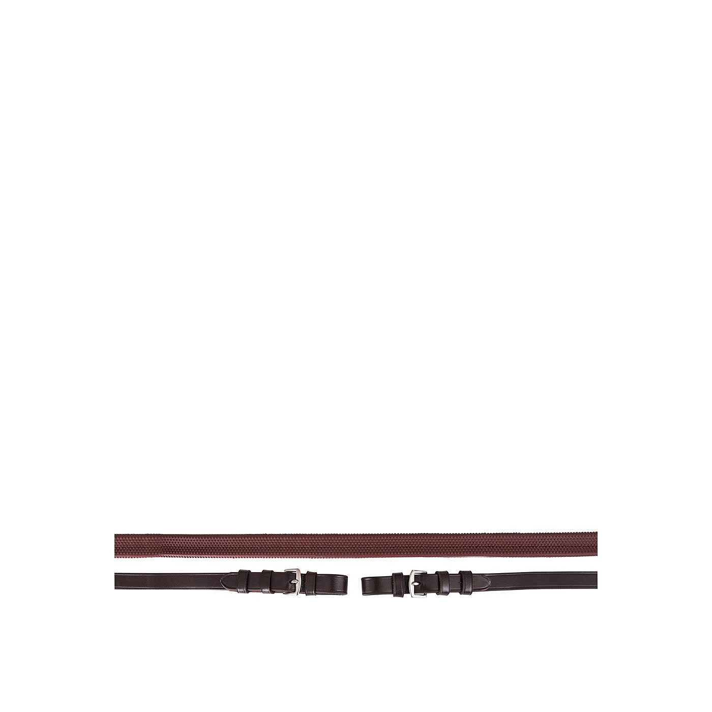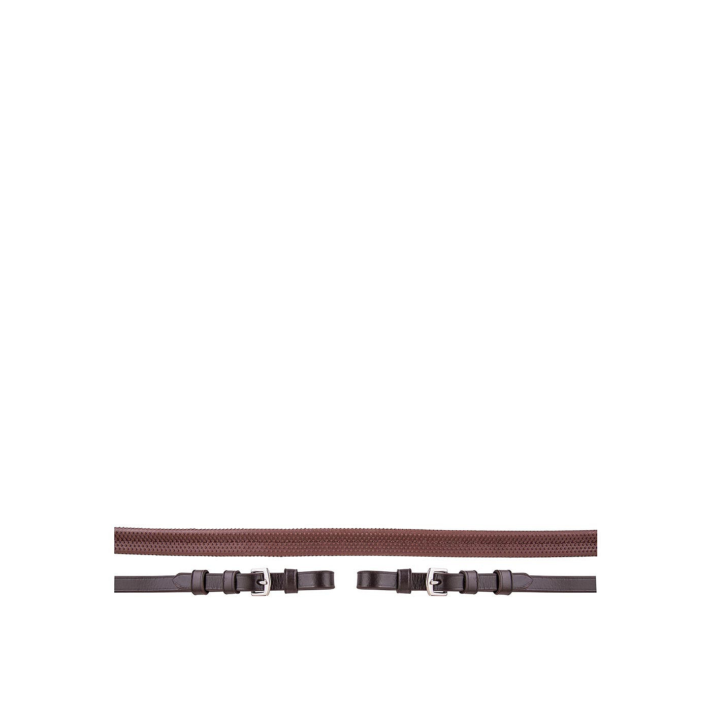 Rubberen grip teugel versterkt met nylon en voorzien van lederen teugelstops, 16 mm breed. De lederen uiteinden met roestvrijstalen gespsluitingen zijn ook 16 mm breed.