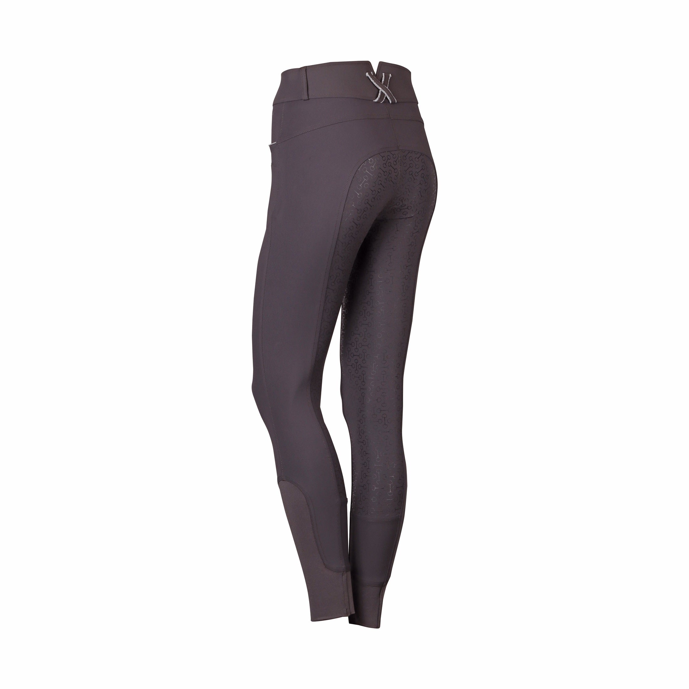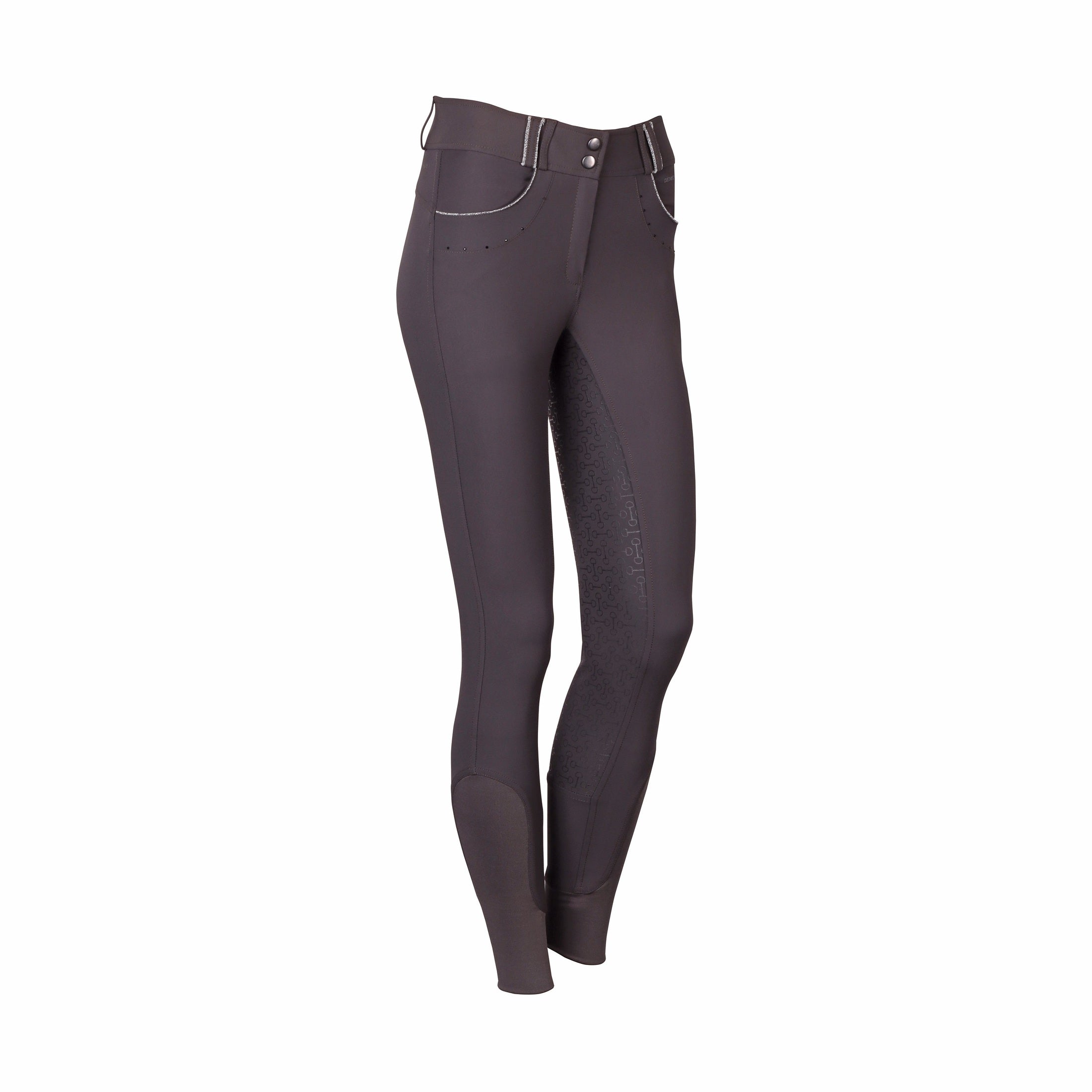 Paardrijbroek met twee steekzakken voorzien van een glitter piping en gunmetal kleurige kristallen, glitter piping op een aantal riemlussen, siliconen print op het zitvlak en een elastische inzet rond de enkels voor meer comfort in je paardrijlaarzen.