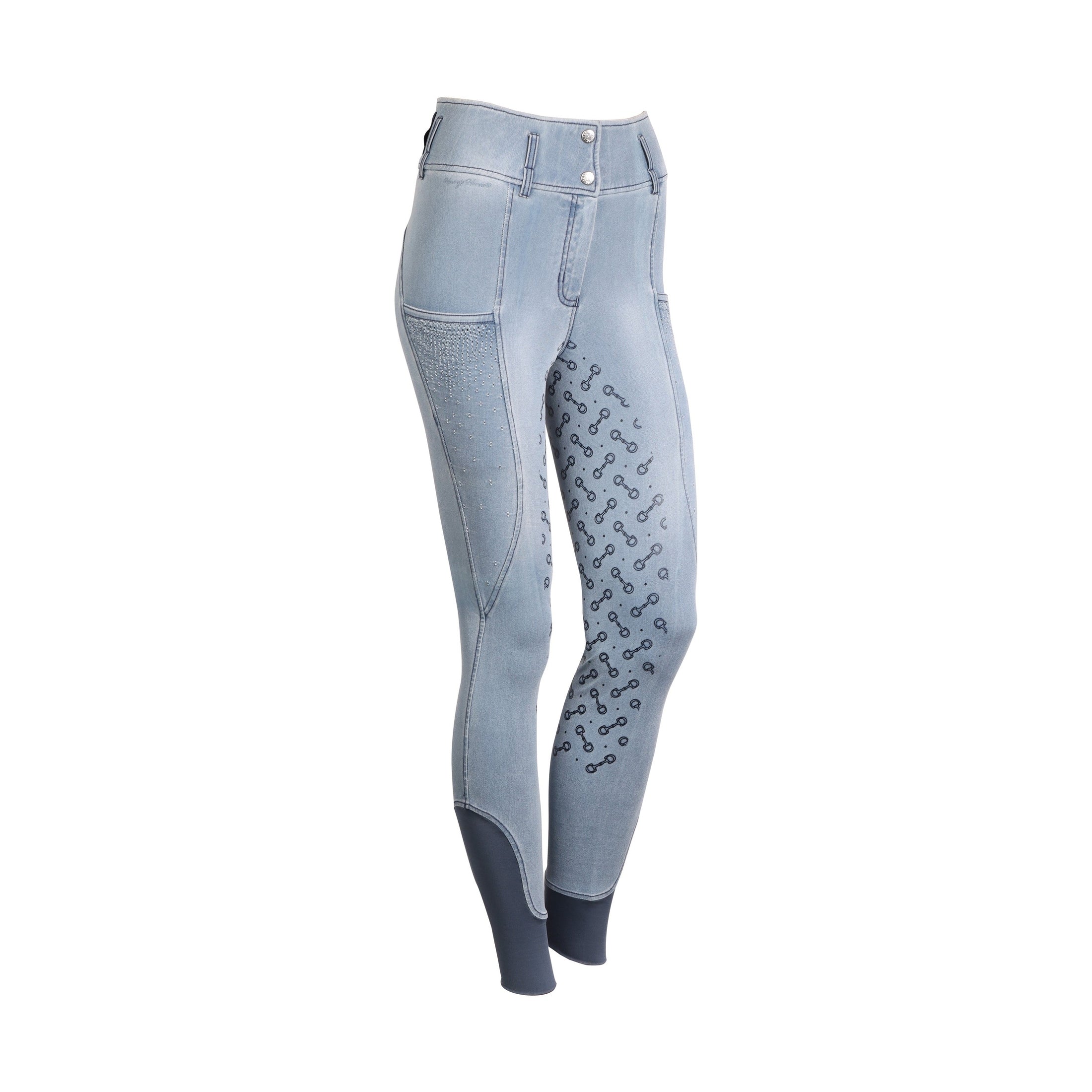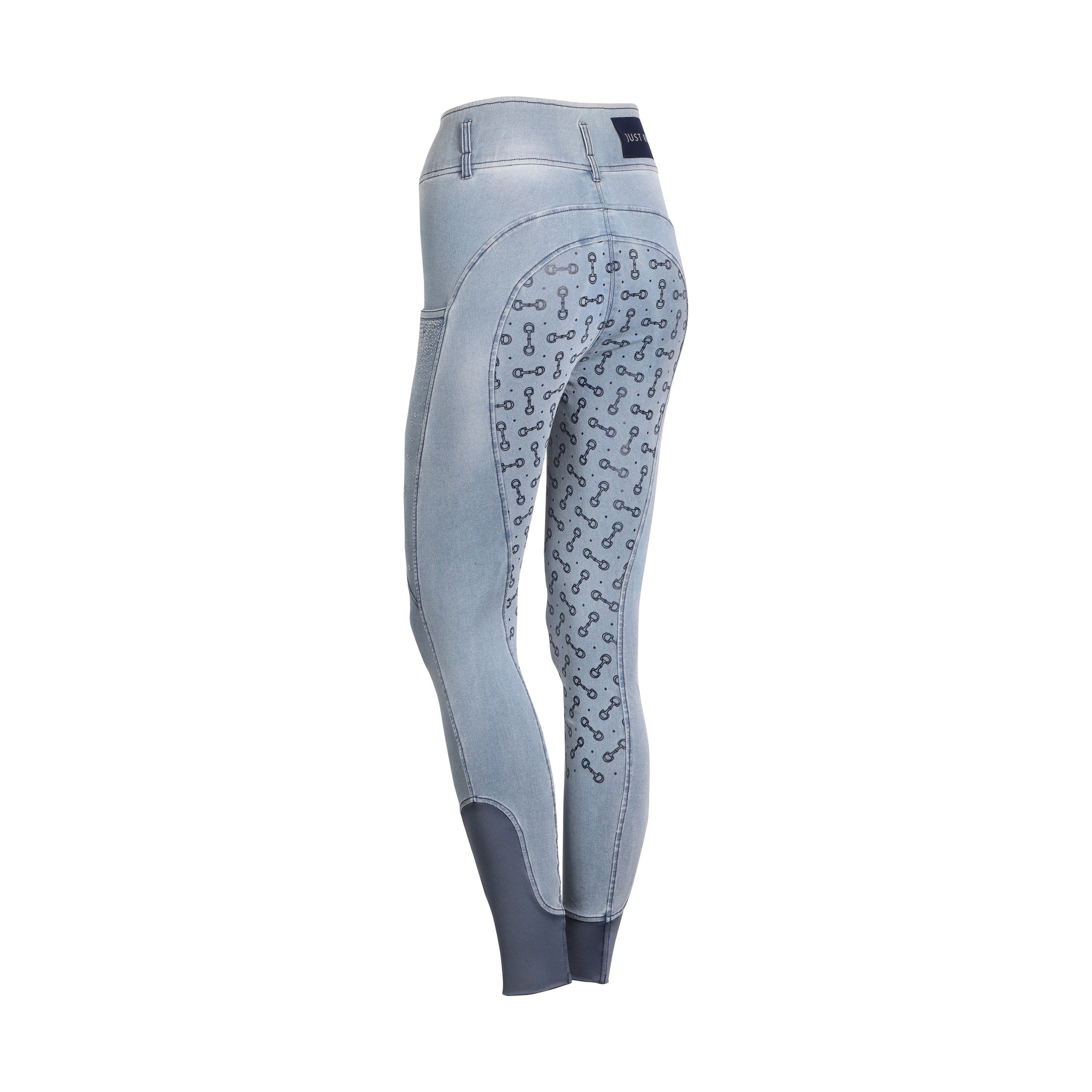 Paardrijlegging in een stretch denim materiaal met twee steekzakken met lasercut details, een brede tailleband met riemlussen en een Just Ride badge aan de achterkant, rondgenaaid zitvlak voorzien van een siliconen print voor extra grip in het zadel en een elastische inzet rond de enkels voor meer comfort in je paardrijlaarzen.