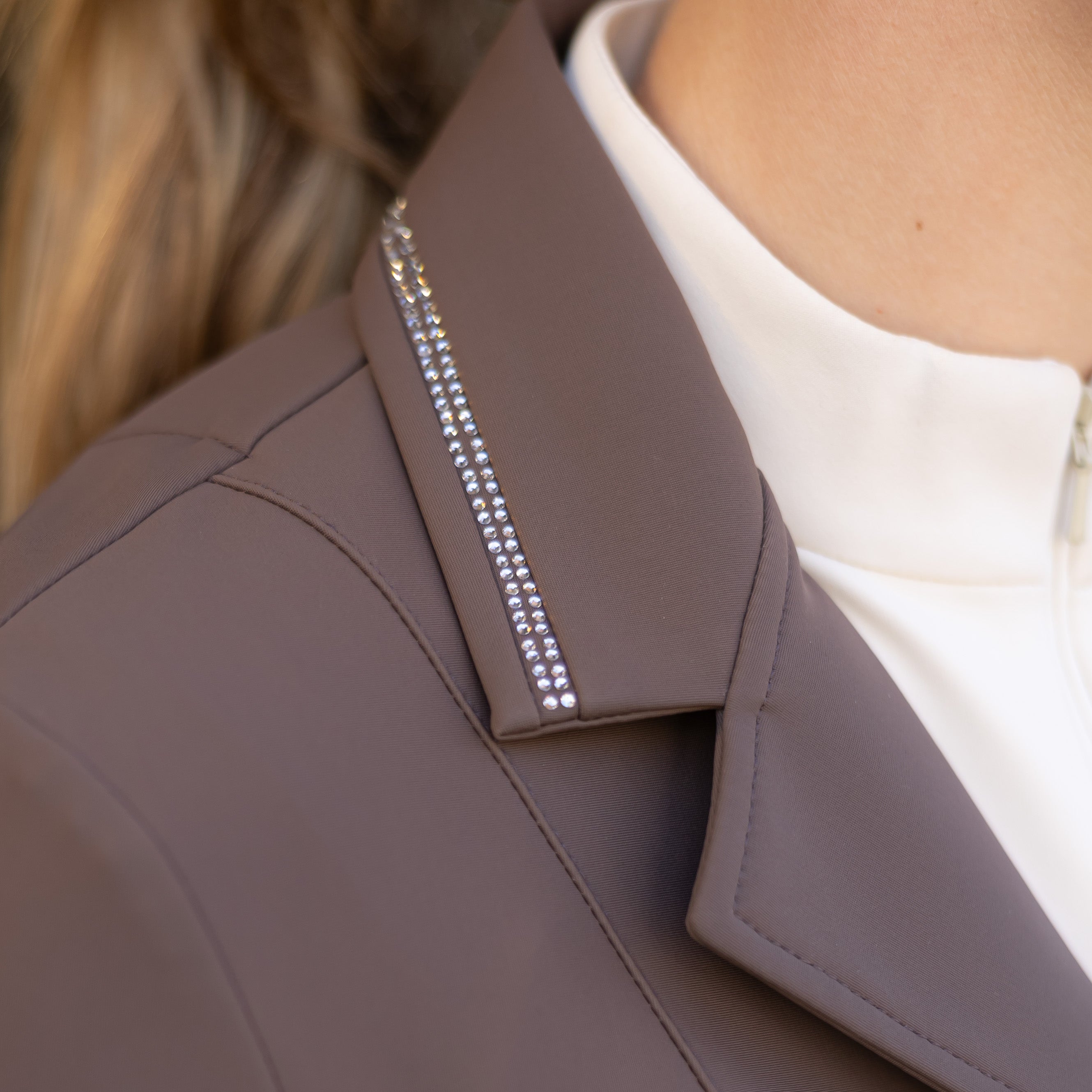 Luxe wedstrijdjas van comfortabel stretch materiaal. Het jasje is uitgevoerd met zilver- en crèmekleurige kristallen op de kraag, twee zakjes met een ritssluiting. Een knoopsluiting met daaronder een ritssluiting voor een perfecte pasvorm.