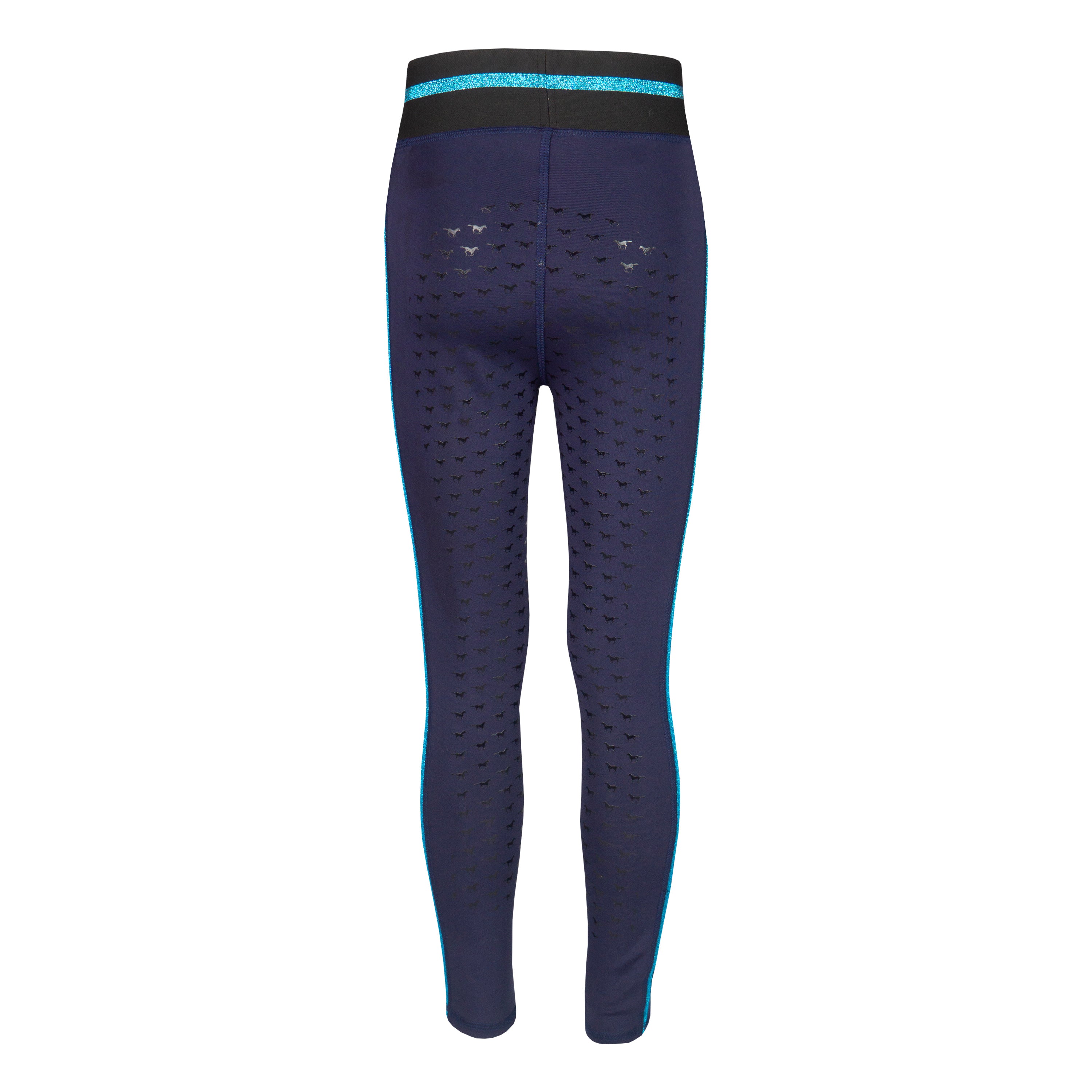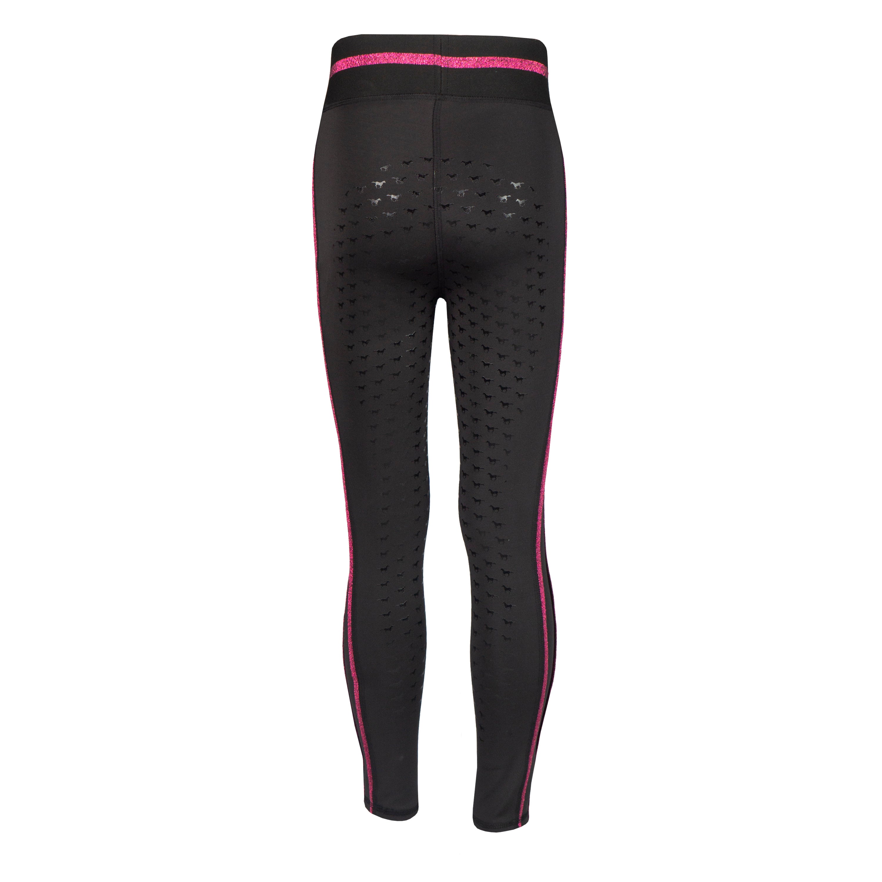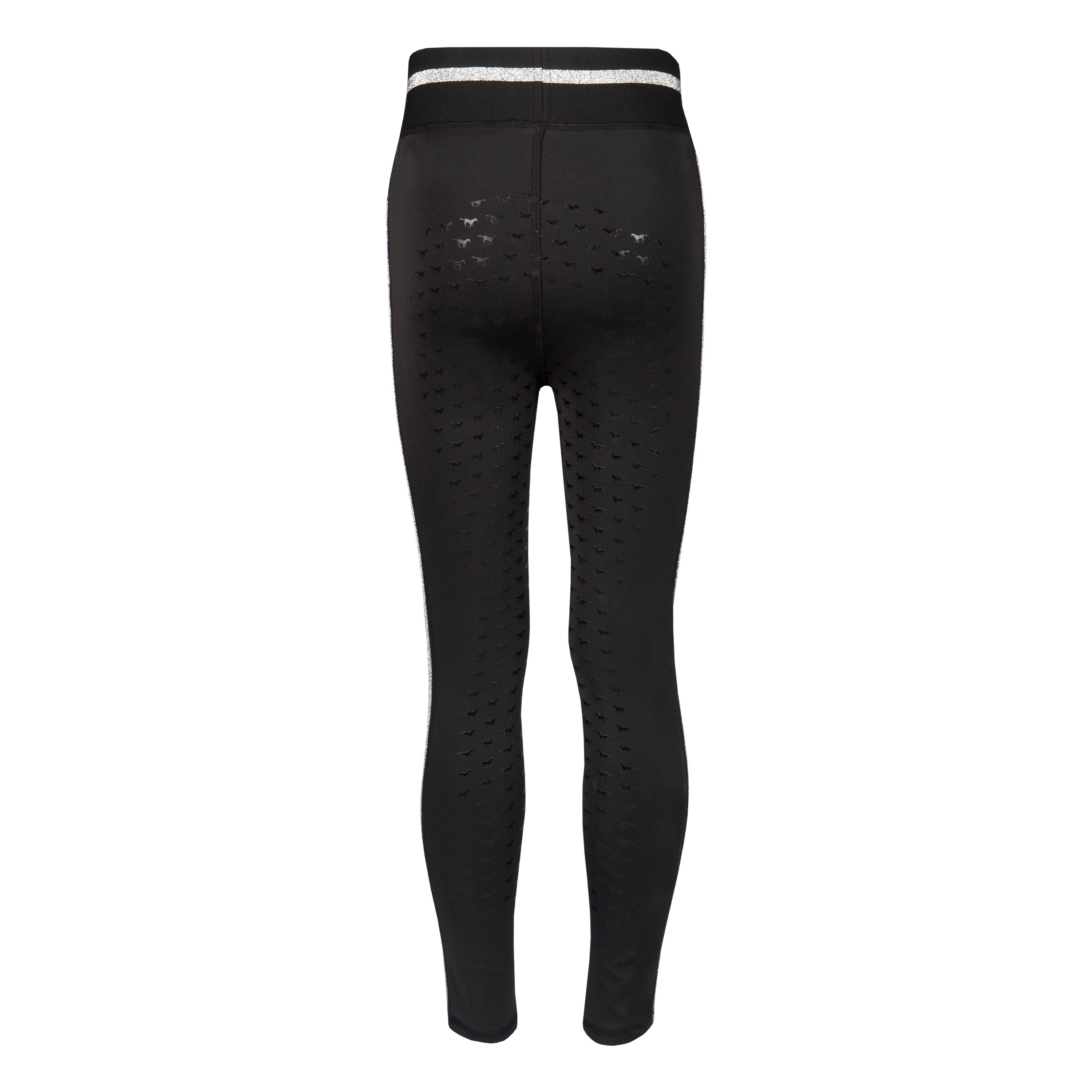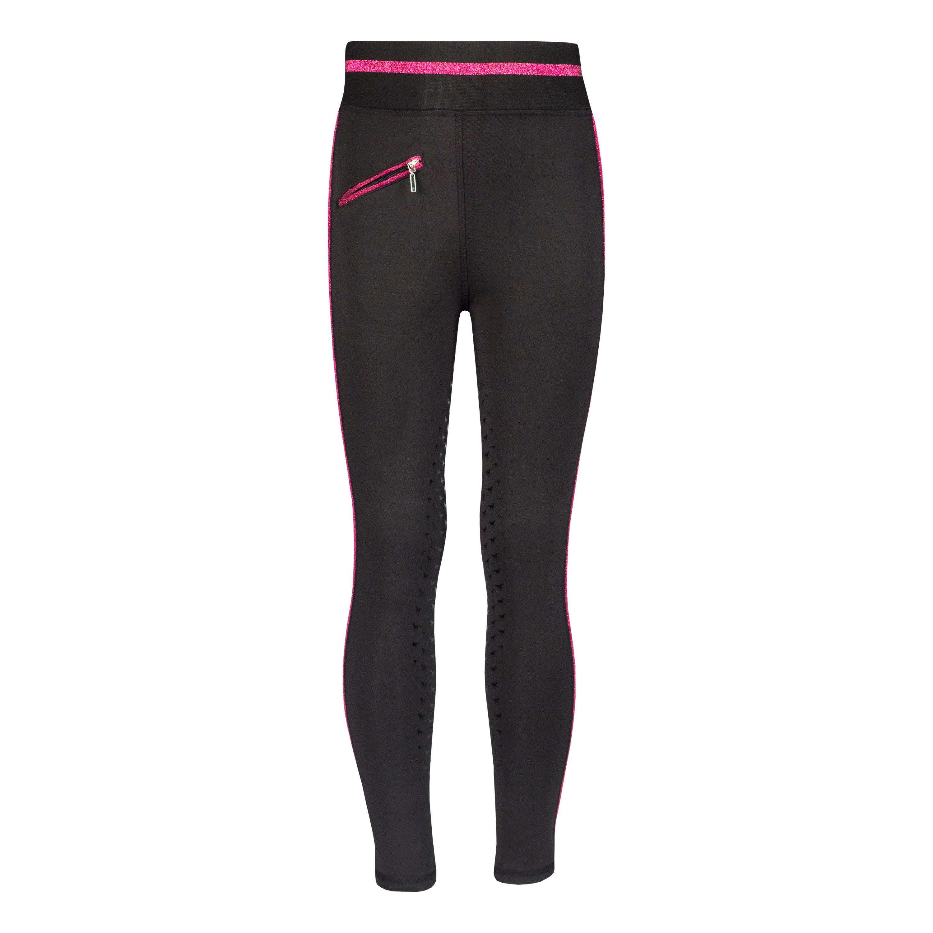 Basis kinderrijlegging met leuke glitter details en een volledig siliconen :zitvlak. De rijlegging is comfortabel door de elastische tailleband en is :voorzien van een ritszak vooraan. Productspecificaties:< Elastische tailleband met lurex glitter strepen Lurex glitter bies aan beide pijpen Artwork in glitterprint in contrasterende kleur Contrasterende broekzak met rits aan de voorkant Volledig siliconen zitvlak Materiaal:< 88% Polyester 12% Spandex :