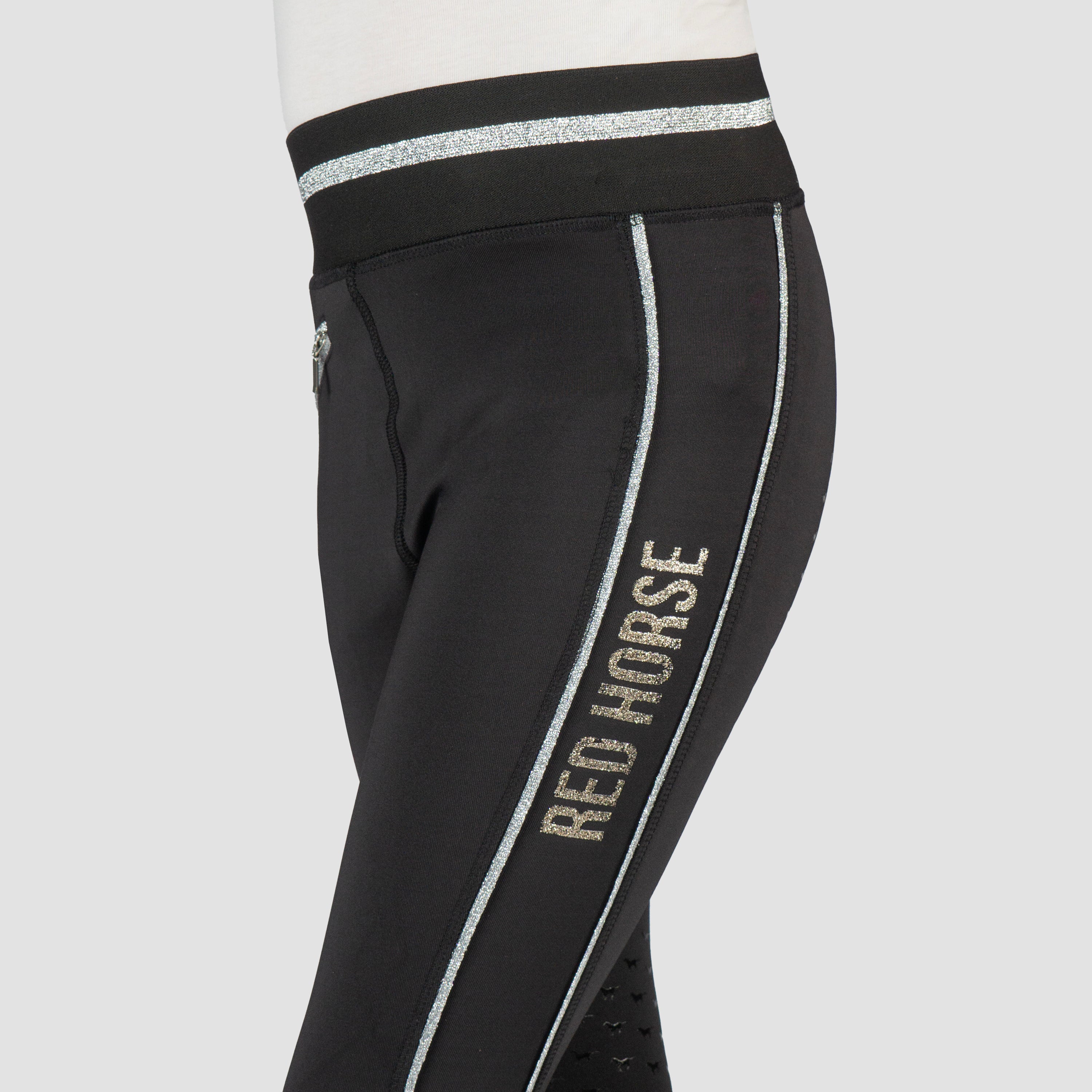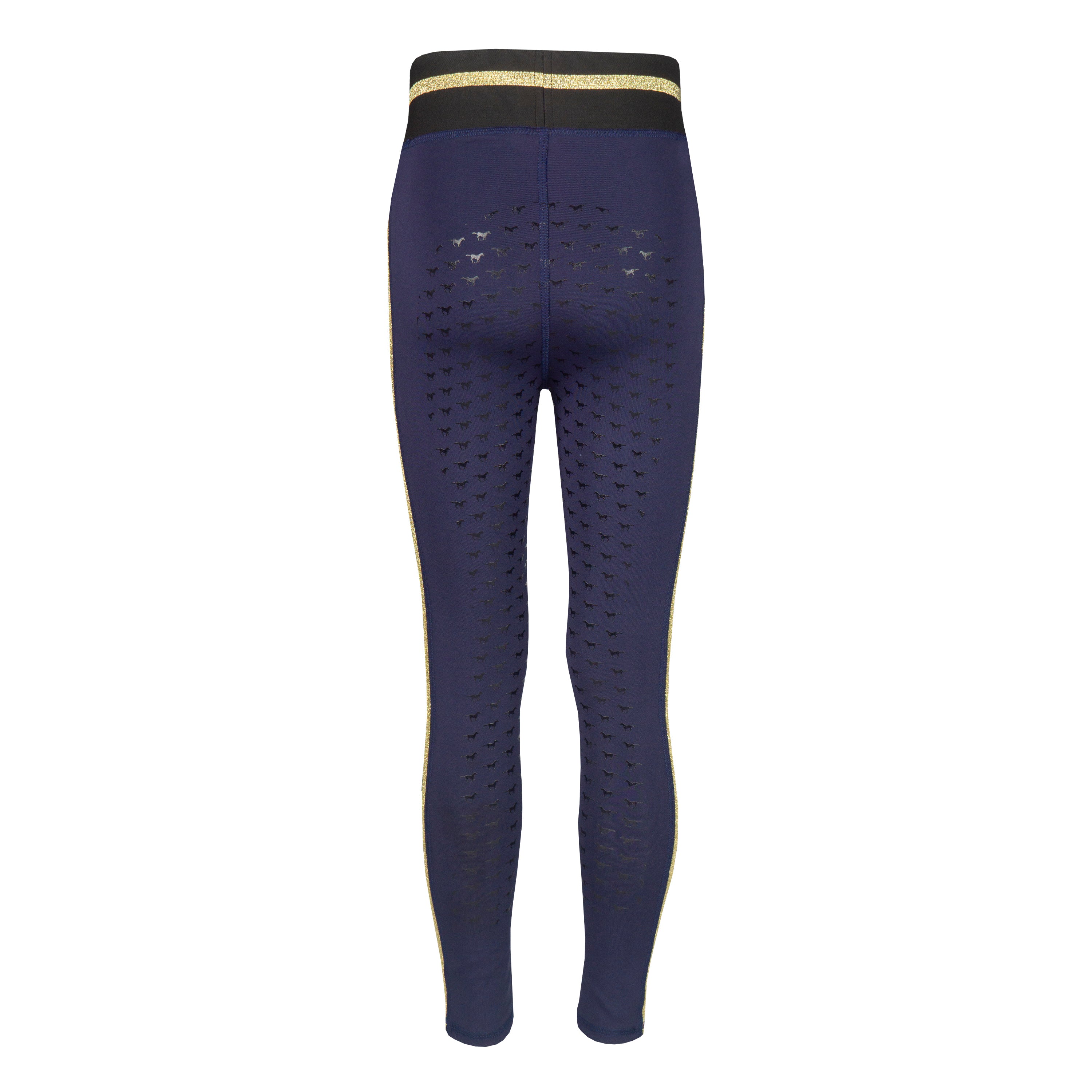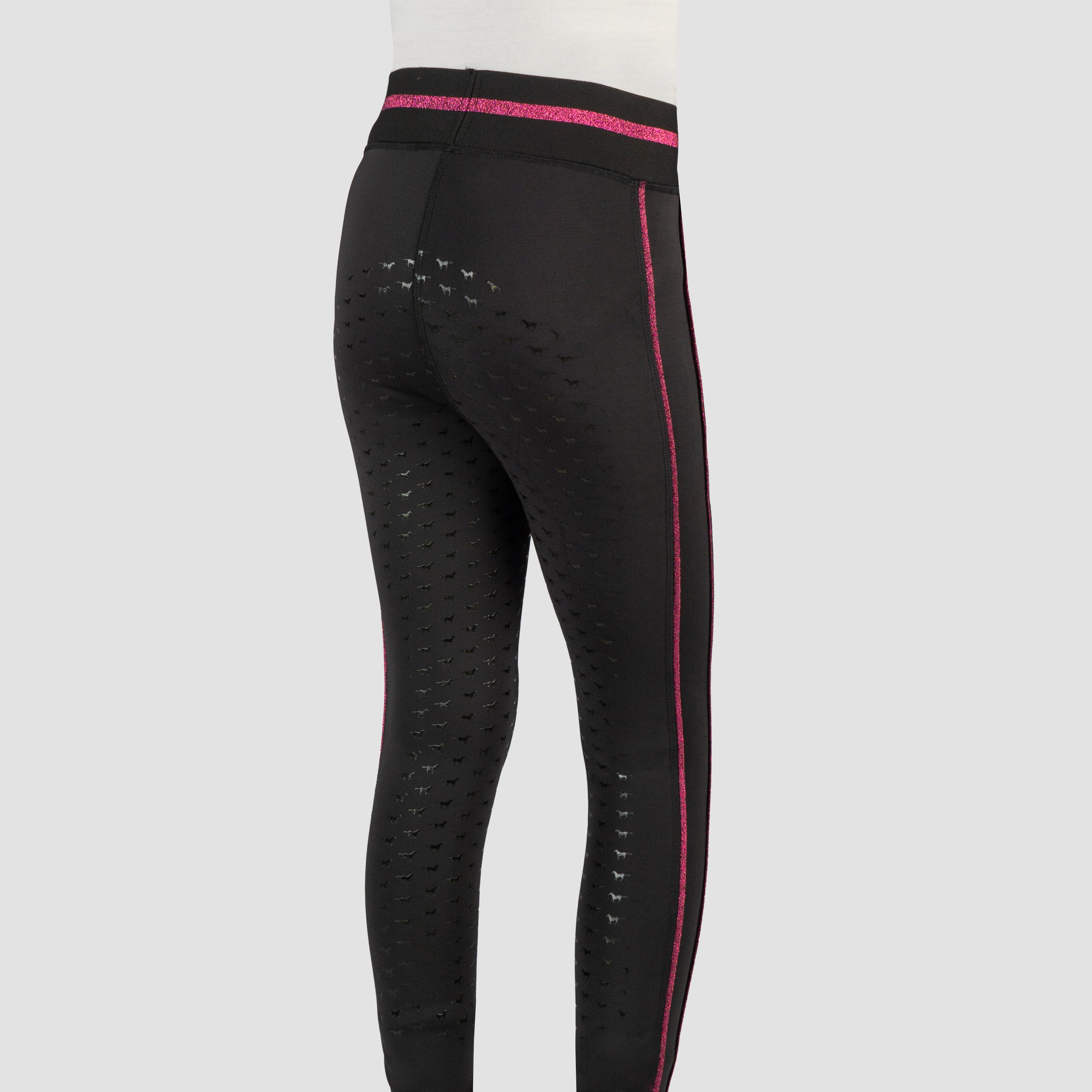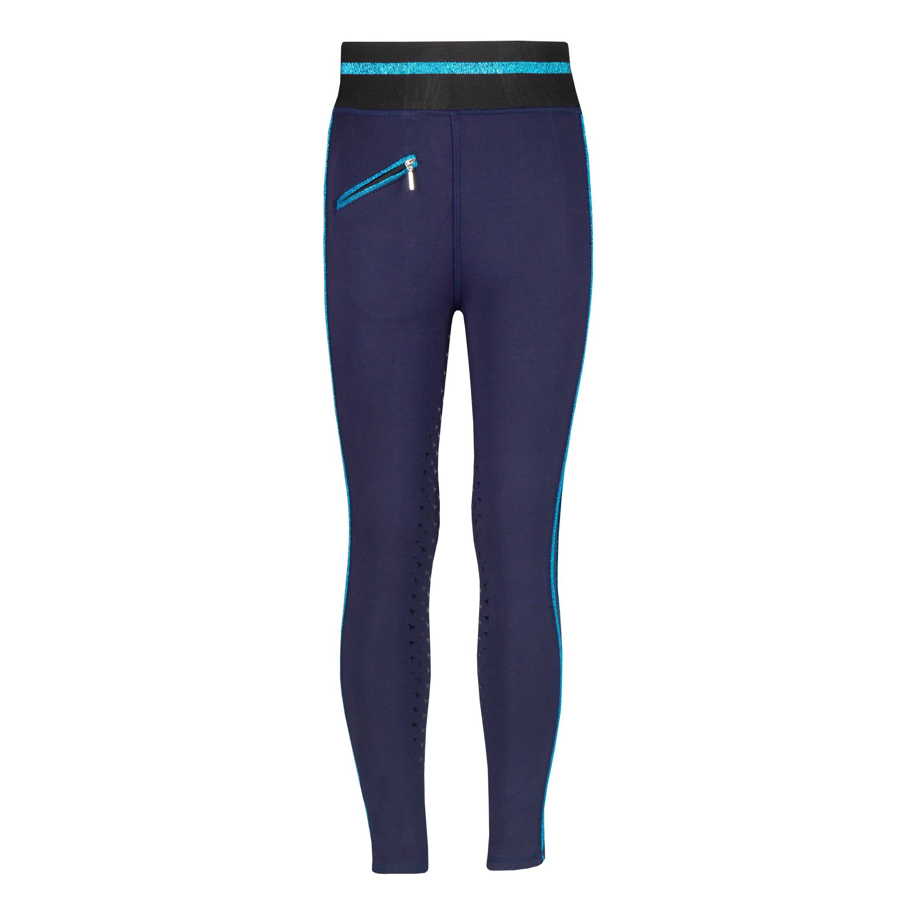 Basis kinderrijlegging met leuke glitter details en een volledig siliconen :zitvlak. De rijlegging is comfortabel door de elastische tailleband en is :voorzien van een ritszak vooraan. Productspecificaties:< Elastische tailleband met lurex glitter strepen Lurex glitter bies aan beide pijpen Artwork in glitterprint in contrasterende kleur Contrasterende broekzak met rits aan de voorkant Volledig siliconen zitvlak Materiaal:< 88% Polyester 12% Spandex :