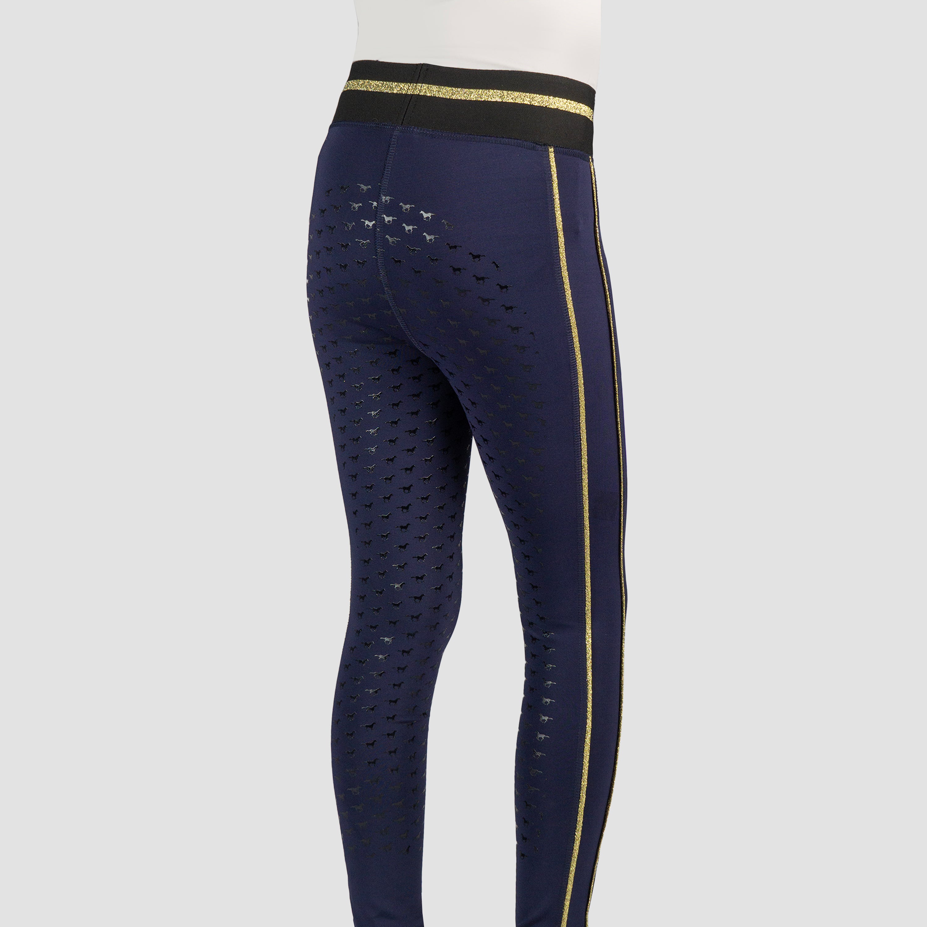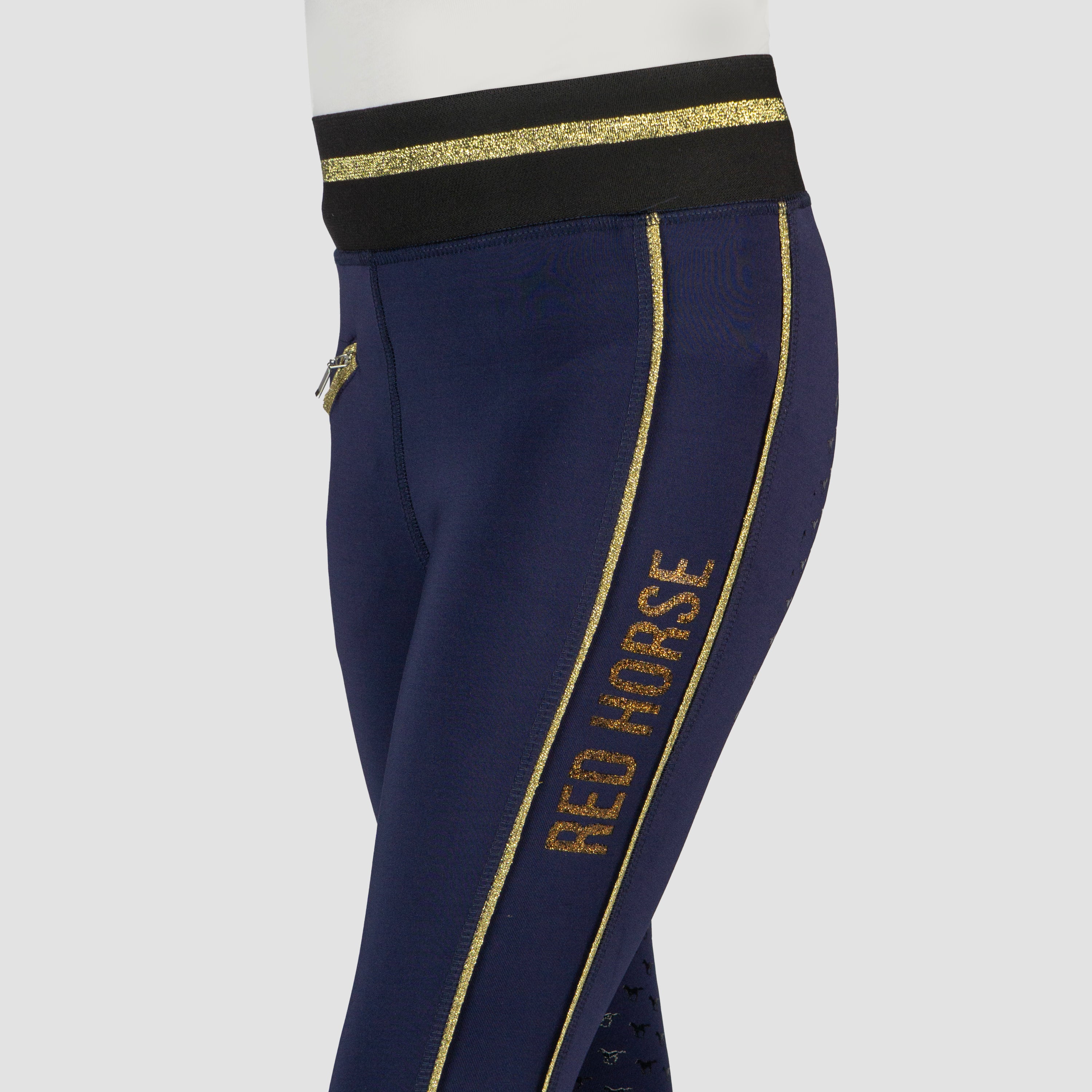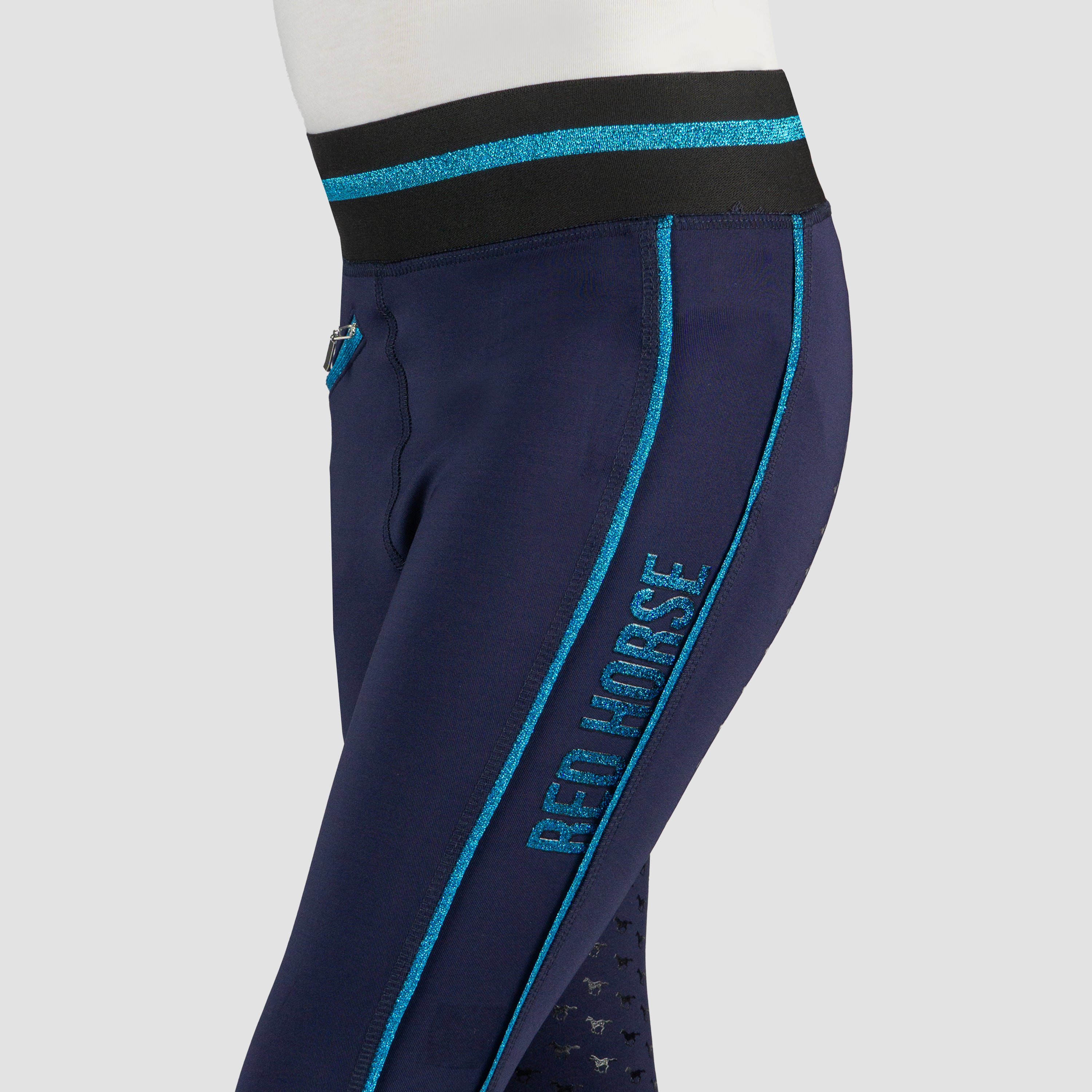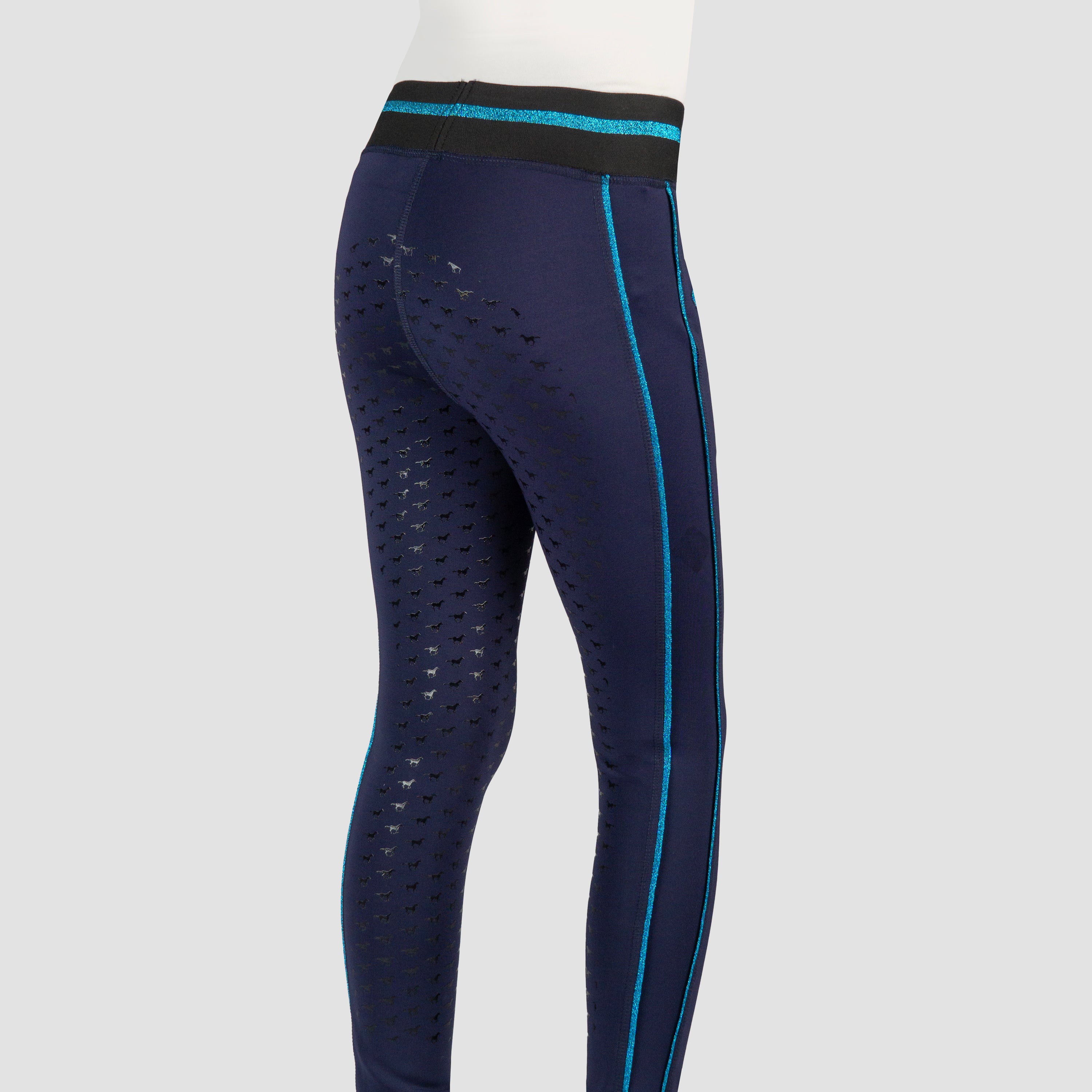 Basis kinderrijlegging met leuke glitter details en een volledig siliconen :zitvlak. De rijlegging is comfortabel door de elastische tailleband en is :voorzien van een ritszak vooraan. Productspecificaties:< Elastische tailleband met lurex glitter strepen Lurex glitter bies aan beide pijpen Artwork in glitterprint in contrasterende kleur Contrasterende broekzak met rits aan de voorkant Volledig siliconen zitvlak Materiaal:< 88% Polyester 12% Spandex :