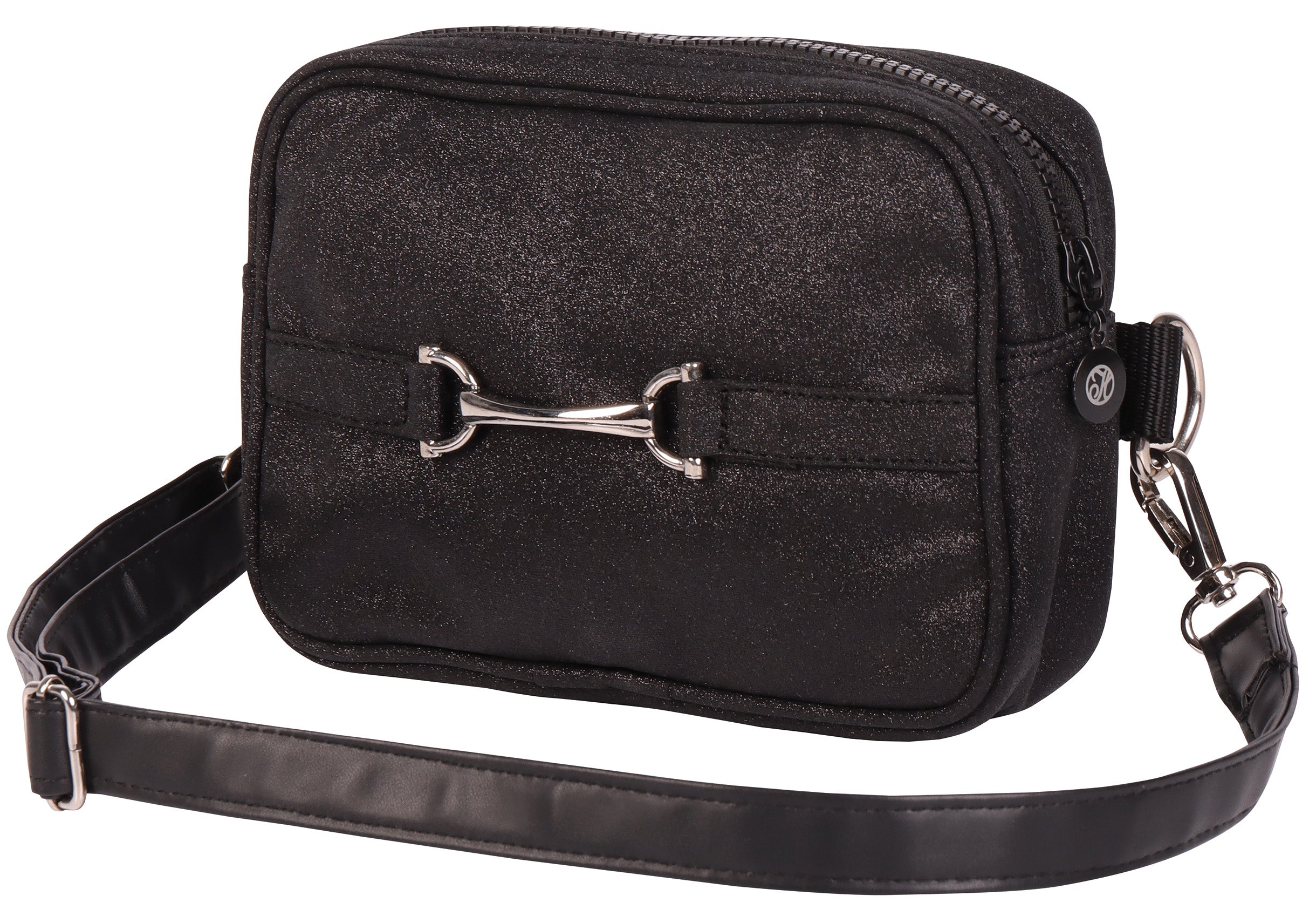 Leuke multifunctionele tas met glitterdetails en een zilverkleurig bitje op de voorkant.
