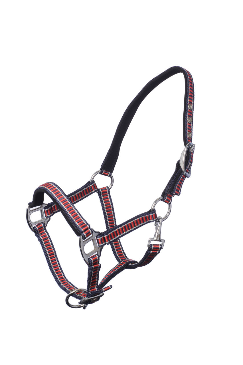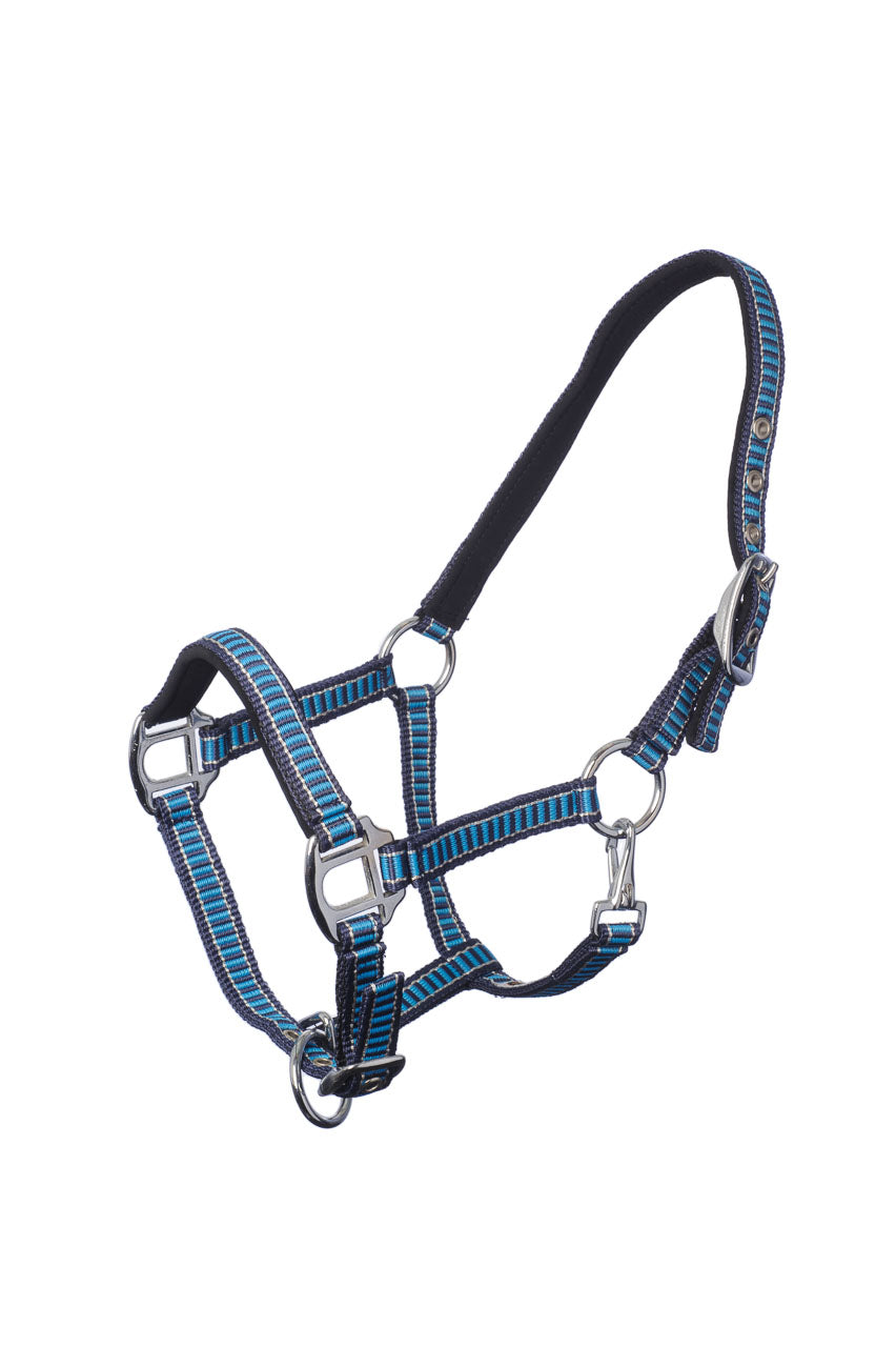 Schitterend nylon halster van zware kwaliteit met een chique uitstraling. Het nylon is niet te breed waardoor dit halster zowel in de minimaten als in de grote maten een luxe uitstraling heeft. Dit mooie halster is ruim verstelbaar onder de kin en op het kopstuk. De halster is makkelijk in gebruik door de handige clip op de kaakriem.