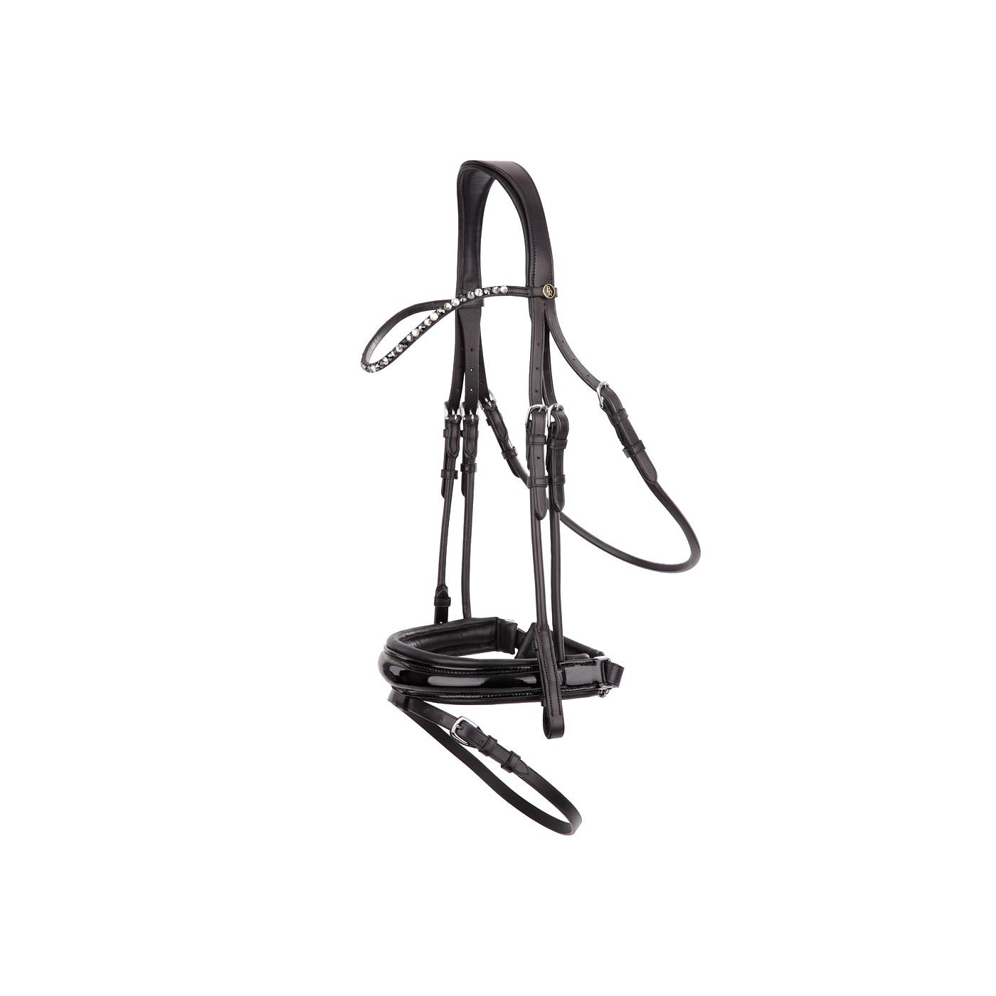 Symmetrisch hoofdstel met een anatomisch gevormd kopstuk. Het kopstuk is heerlijk zacht gevoerd. Het smalle, licht gebogen frondeel is voorzien van Oostenrijkse kristallen van de hoogste kwaliteit in drie verschillende kleuren. De extra brede, gecombineerde aansnoerneusriem (circa 4.5 cm) met lakleder is rond gebombeerd, zacht gevoerd en voorzien van een brede, zacht gevoerde kaakbeschermer. De neusriem is bovendien anatomisch gevormd. Het hoofdstel heeft een V-vormige sperriemlus en blinde sluitingen en de gesp van de sperriem heeft een extra beschermflap. Neusriem, keelriem en bakstukken zijn van rondgenaaid leder. Het hoofdstel is voorzien van ronde, glanzende, zilverkleurige fournituren. Exclusief teugel.