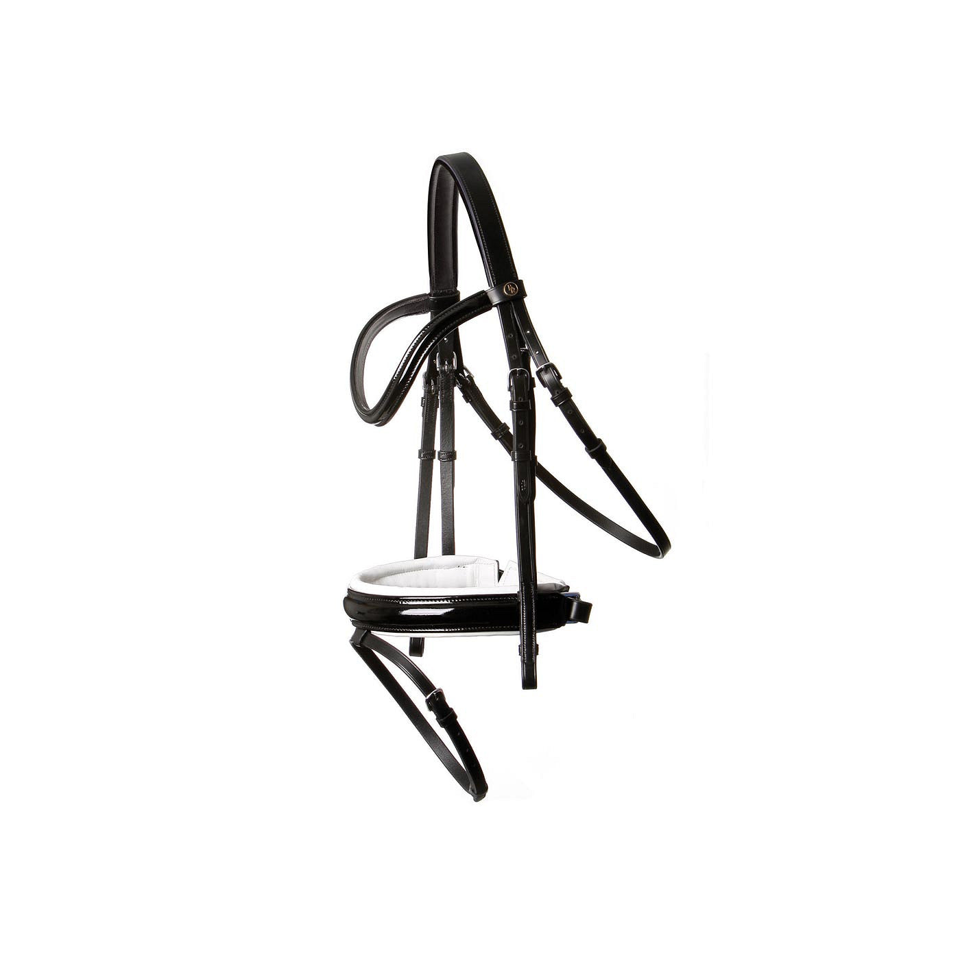 Symmetrisch hoofdstel met zacht gevoerd kopstuk. Het gebogen, laklederen frondeel is rond gebombeerd en met zacht leder onderlegd. De extra brede, gecombineerde aansnoerneusriem (circa 4.5 cm) met lakleder is rond gebombeerd, zacht gevoerd en voorzien van een brede, zacht gevoerde kaakbeschermer. Het hoofdstel is voorzien van een V-vormige sperriemlus, blinde sluitingen en ronde, glanzende, zilverkleurige fournituren. Exclusief teugel.