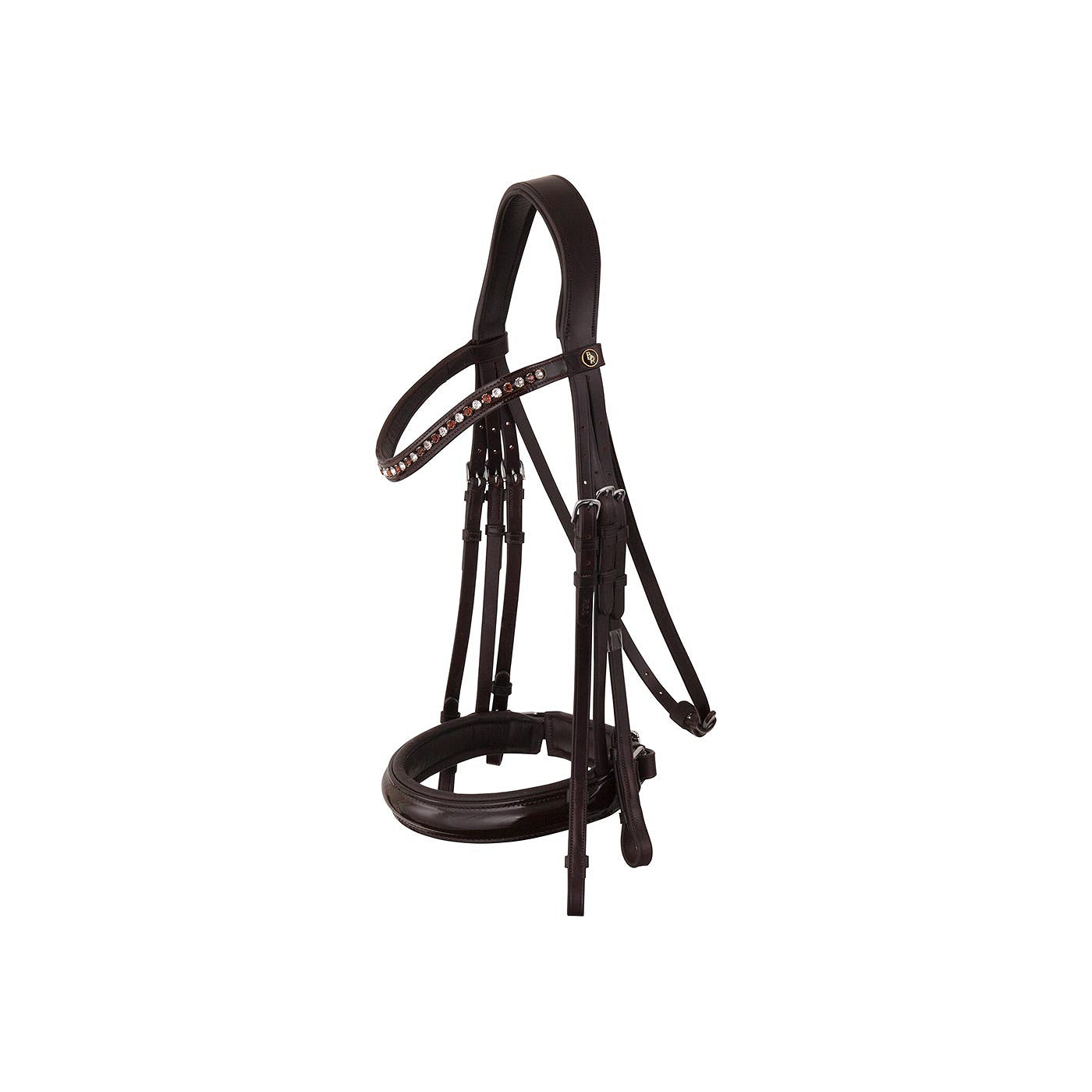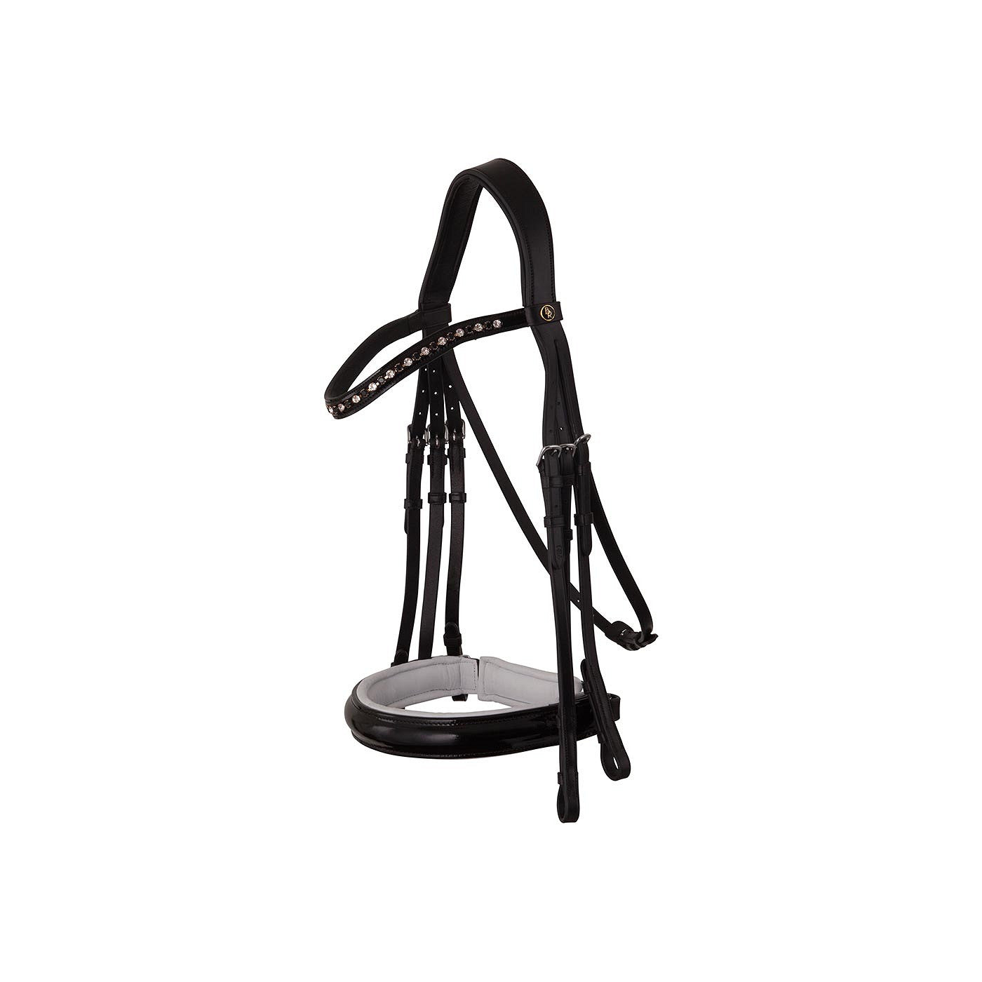 Symmetrisch hoofdstel met anatomisch gevormd kopstuk. Het kopstuk is heerlijk zacht gevoerd. De keelriem is verstelbaar met ŽŽn gespsluiting aan de onderzijde. Het gebogen frondeel met lakleder is ingelegd met Oostenrijkse kristallen en onderlegd met zacht leder. De extra brede aansnoerneusriem (circa 4.5 cm) met lakleder is rond gebombeerd, zacht gevoerd en voorzien van een brede, zacht gevoerde kaakbeschermer. Het hoofdstel is voorzien van blinde sluitingen en ronde, glanzende, zilverkleurige fournituren. Exclusief teugels.