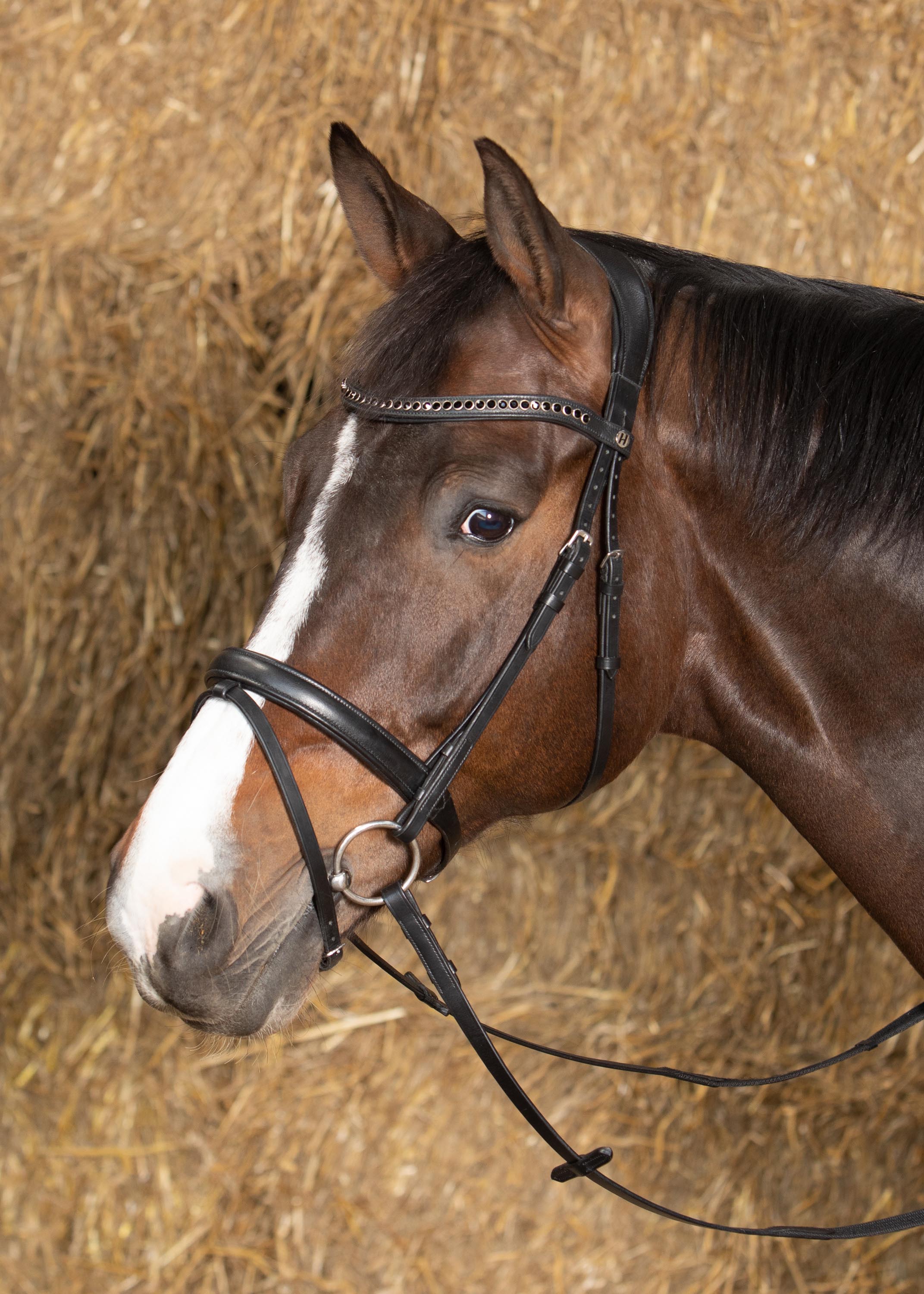 Uitgevoerd met hangende frontriem. Dit draagt bij aan verminderde druk bij de oren van het paard.