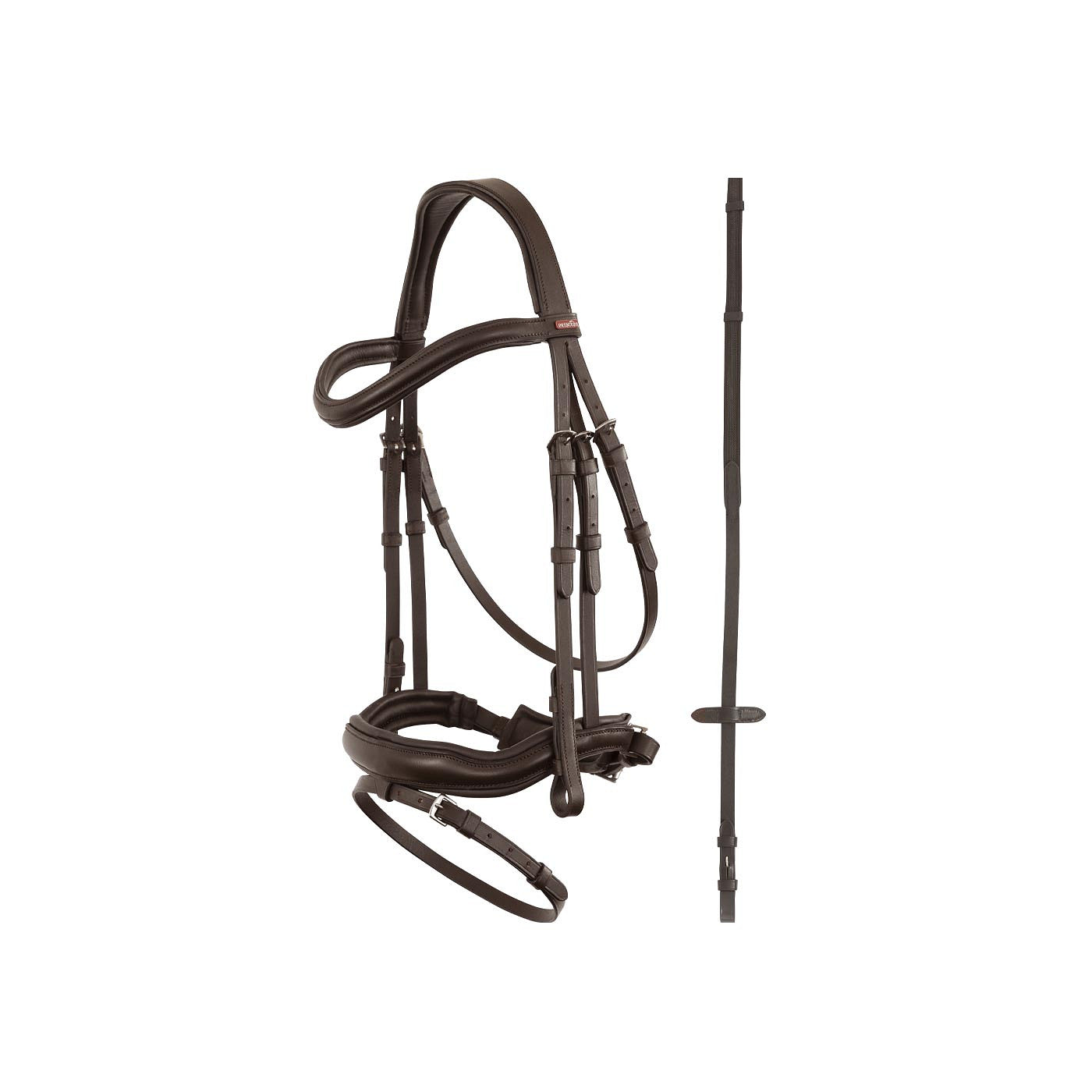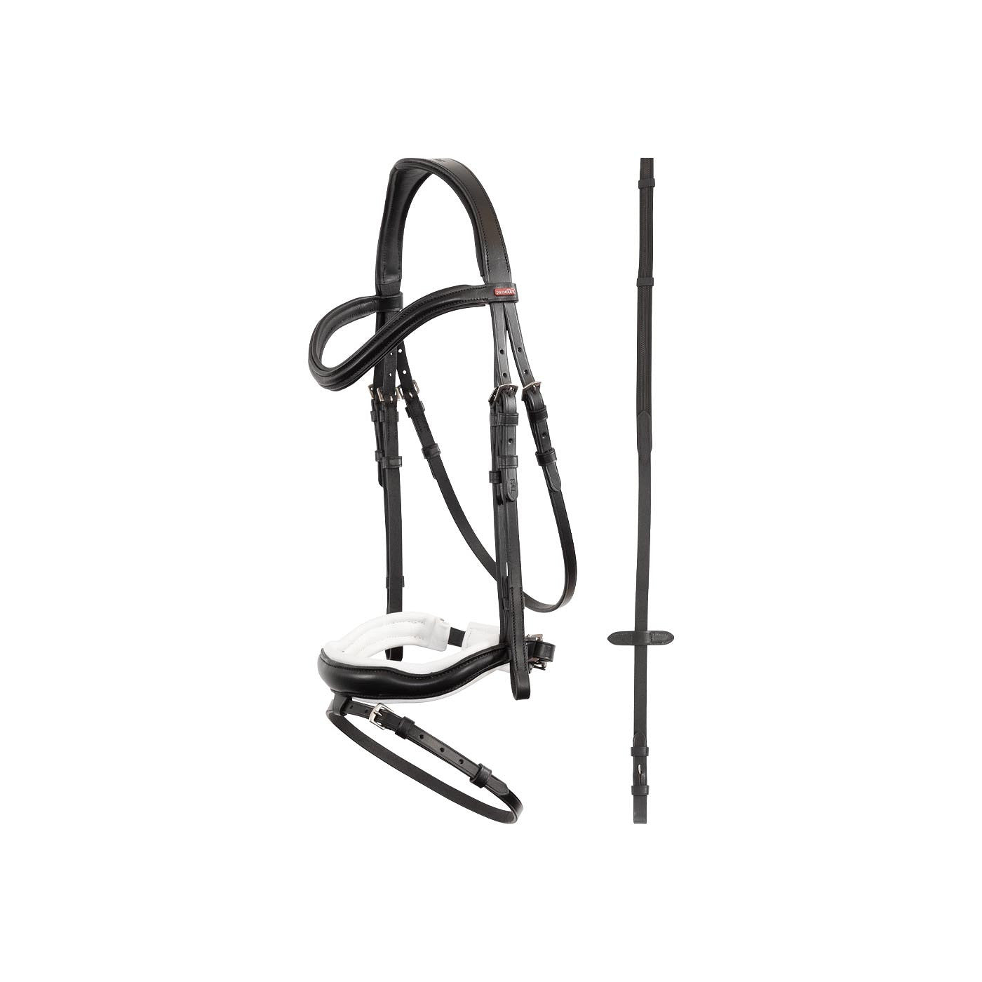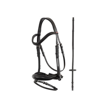 Dit comfortabele Premiere hoofdstel is gemaakt van zacht, soepel leder en is anatomisch gevormd. Hierdoor sluit het hoofdstel netjes aan op het paardenhoofd en zorgt het voor een goede drukverdeling. Het kopstuk, de gecombineerde neusriem en de brede kaakbeschermer zijn voorzien van een zachte voering voor optimaal comfort. Het gebogen frondeel en de rond gebombeerde neusriem hebben een rustige, effen uitstraling. Het hoofdstel wordt geleverd inclusief bijpassende antislipteugels.