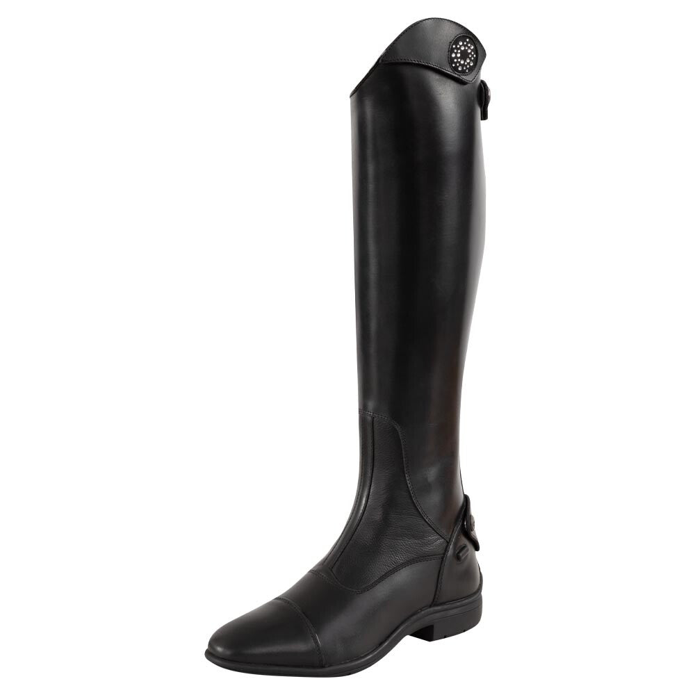 De Premiere rijlaars Taminiau heeft een klassieke uitstraling en is gemaakt van kwalitatief Europees leder dat lang mooi blijft. Met de drie meegeleverde verwisseltops kun je de rijlaarzen regelmatig een net iets andere touch geven: klassiek leder, lakleder of een patroon van strass-steentjes. Je plakt ze gemakkelijk op de top dankzij het klittenband.