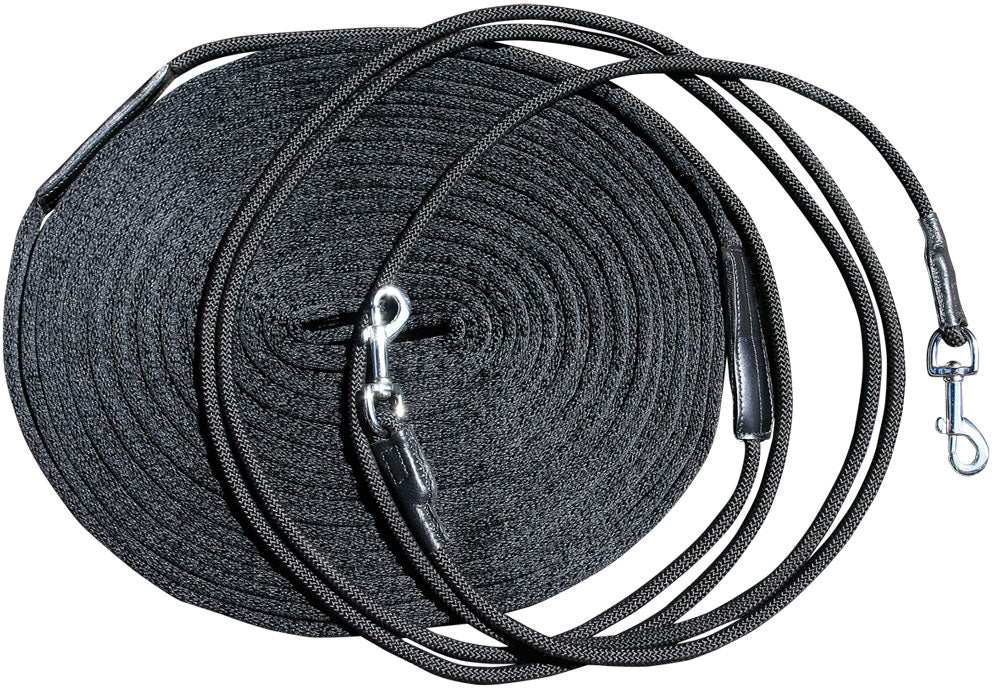 Dubbele longeerlijn bestaat uit twee ronde koorden, te bevestigen aan de bitringen door middel van twee zilverkleurige muskatonnen. Daarna gaat dit over in een plat, soft webbing lijn.