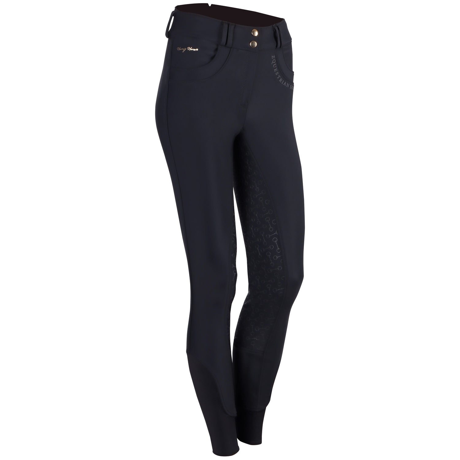 Paardrijbroek met steekzakken voorzien van een print, twee kontzakken voorzien van een ritssluiting, brede tailleband met riemlussen, rondgenaaid zitvlak met siliconen print voor extra grip in het zadel en een comfortabele elastische inzet rond de enkels.