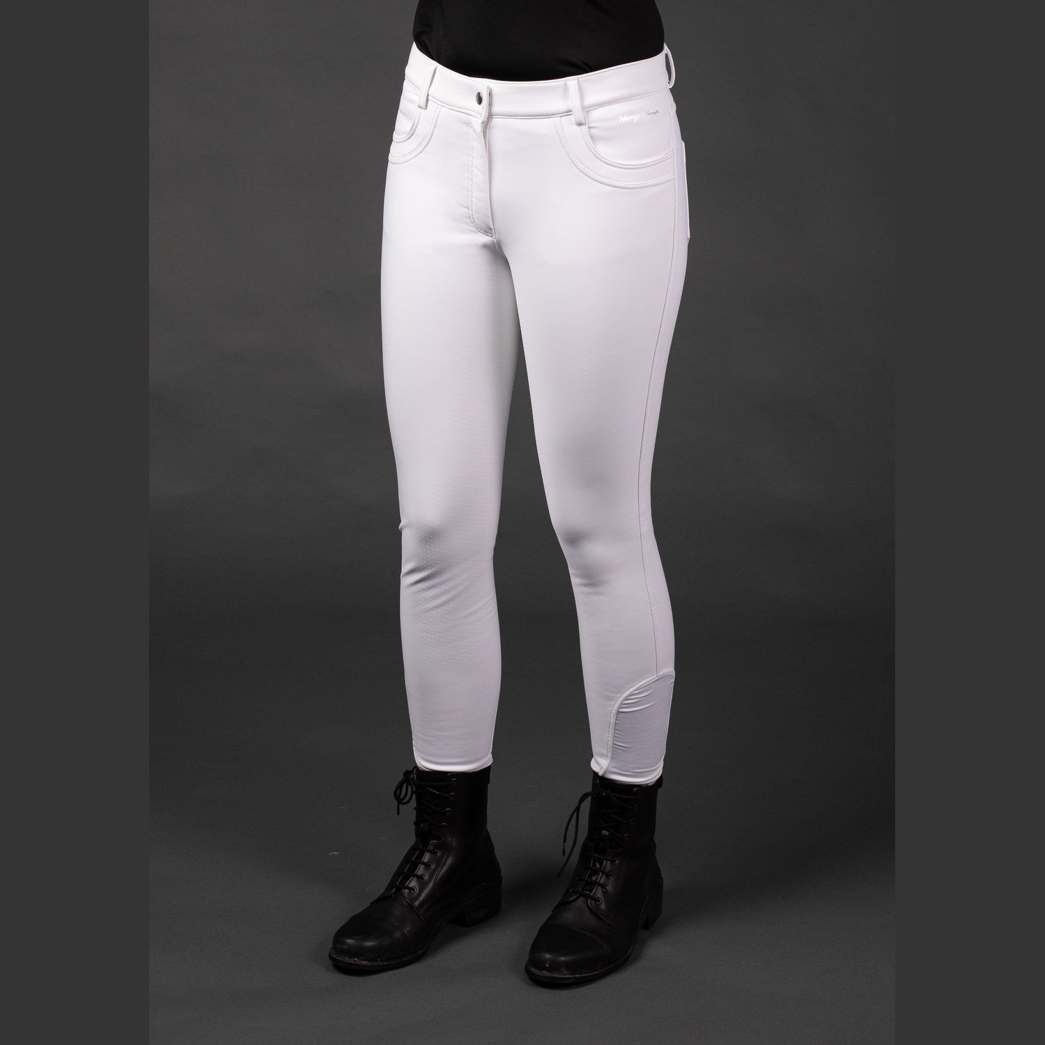 Waterafstotende rijbroek met rondgenaaid zitvlak voorzien van siliconen grip, twee kontzakken en "Flexlegs". Subtiel afgewerkt met sierstiksels en riemlusjes. Fijne 4-way stretch softshell stof met fleece aan de binnenzijde. Ideale broek voor de winter.