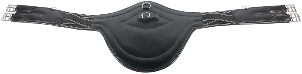 Lederen buikflapsingel met rundlederen voering. Beide zijden met elastiek aan het begin van de singelstoten voor extra bewegingsvrijheid bij de buik. Met rvs rolgespen en D-ring op buikflap (voor hulpteugels).