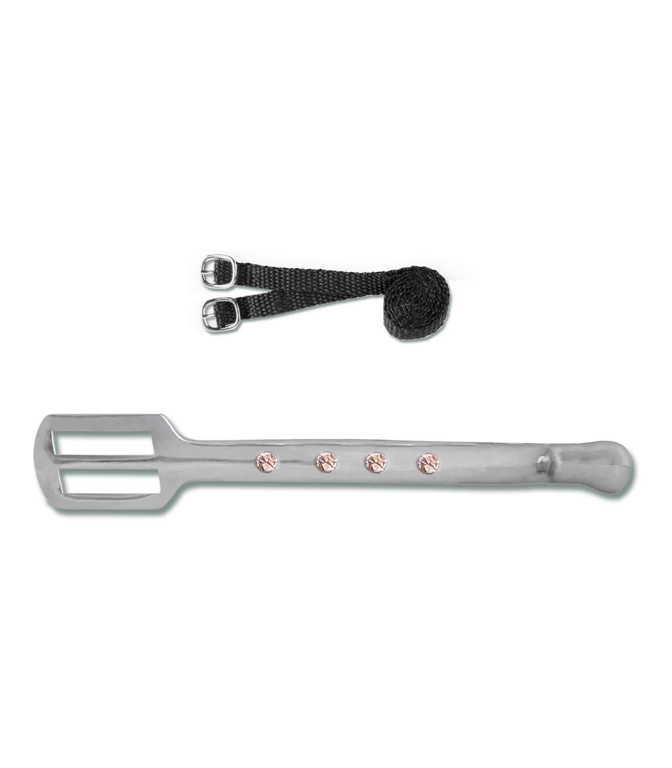 Spurs with shank, set with rhinestones on the outside. With perlon spur straps, rust-proof, pair.