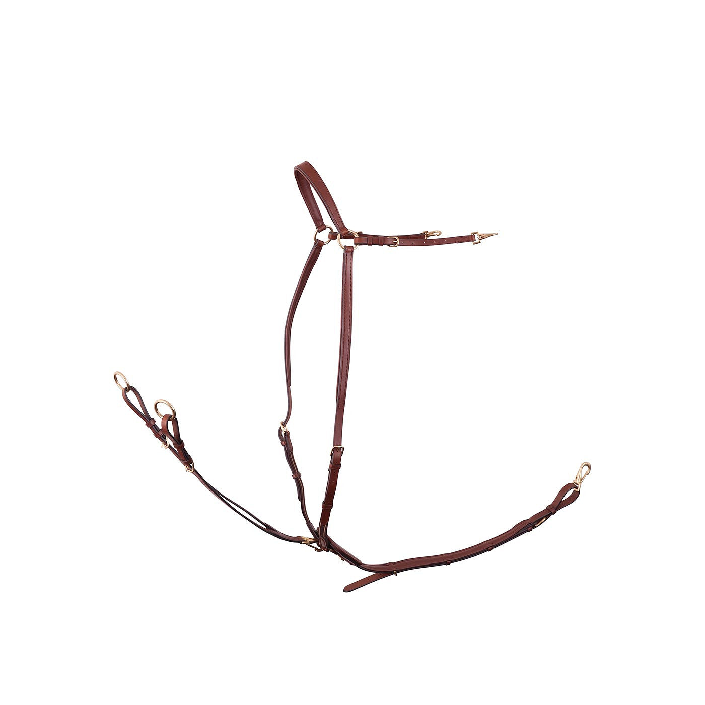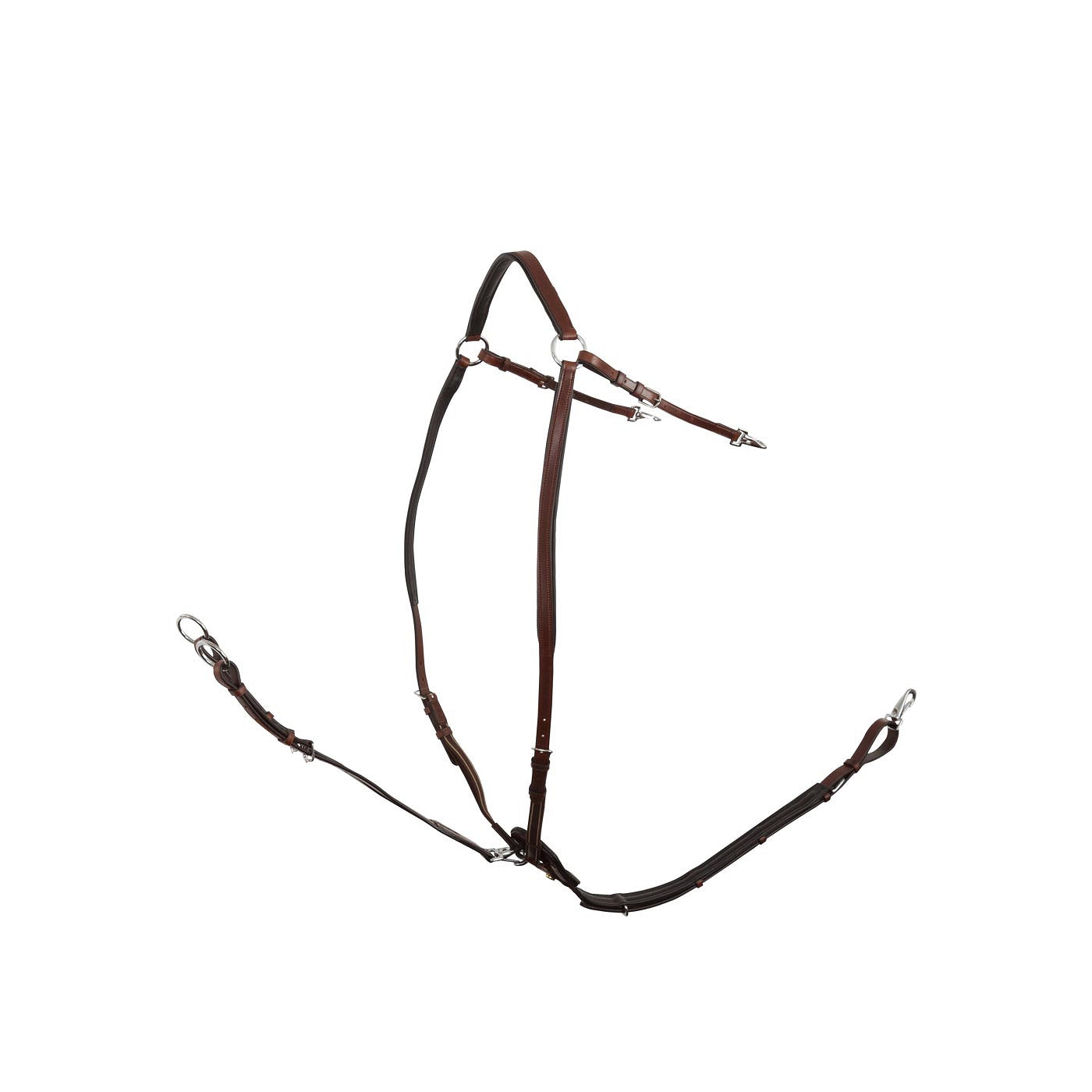 Luxe lederen voortuig met vele verstelmogelijkheden. Het voortuig kan eenvoudig aan het zadel bevestigd worden met musketons aan de onderzijde van de singel. Voor de bevestiging zijn er twee opties: met een musketon of met een lederen lus met een gespsluiting. Het borsttuig is uitgevoerd in het beste volnerf Europese leder, dit leder is sterk, soepel, voelt zacht aan en is duurzaam. De meeste delen zijn zacht onderlegd en het geheel is mooi afwerkt en voorzien van hoge kwaliteit roestvrije messing fournituren. Het voortuig wordt geleverd met een verstelbare, lederen martingaalvork voorzien van een musketon, zodat deze eenvoudig eraf gehaald of erop gezet kan worden. Het zwarte voortuig heeft glanzende, zilverkleurige fournituren en het Tobacco voortuig heeft matte, messingkleurige fournituren.
