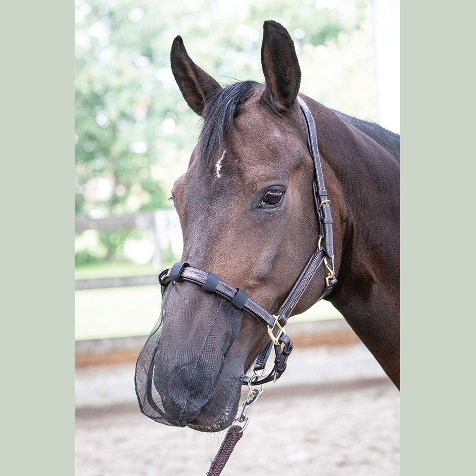 Zeer effectieve neusbescherming. Speciaal anatomisch gevormd om de neus maximaal te beschermen tegen vliegen, pollen en andere zaken die de neus binnen kunnen dringen en het paard irriteren. De ademhaling van het paard en het bitgebruik worden niet belemmerd door gebruik van de Nose Net.