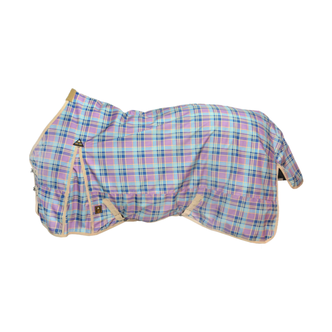 De MHS Turnoutdeken Versace 300 grams is gevoerd met glad nylon. Uitgerust met verstelbare dubbele voorsluiting, verstelbare kruissingels, extra hoge loopsplitten, verstelbare- en afneembare bilkoorden en een staartflap. De buitenstof is gemaakt van 600 denier met ripstop. Is 3000 mm waterdicht en 3000 g/m2 24u ademend. Deze mooie turnoutdeken is verkrijgbaar in verschillende maten en uitvoeringen. Ideale deken als extra bescherming tegen regen en wind op de natte dagen.