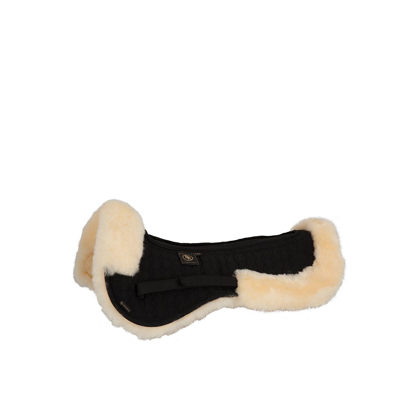 Katoenen zadelonderlegger met een medicinaal gelooide schapenvacht rand. De onderlegger heeft een uitsparing voor het wervelkanaal gemaakt van air mesh. Dankzij de Air Mesh uitsparing wordt de luchtcirculatie verbeterd en oververhitting voorkomen.