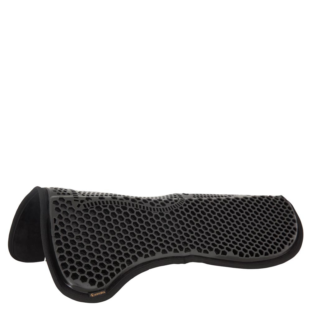 Deze anatomisch gevormde gel pad heeft aan de bovenzijde een honingraatprofiel van soft gel en aan de onderzijde een bekleding van microfiber. Bij de schoft is de pad niet bekleed en er is extra ruimte vrijgehouden voor de wervelkolom, zodat de lucht hier vrij over de paardenrug kan circuleren. Het honingraatprofiel van gel werkt schokabsorberend en stabiliseert het zadel. BR therapeutische soft gel heeft uitstekende antislip eigenschappen; ondersteunt geen bacteriegroei en is niet giftig. De pad kan daarom direct op de paardenrug gebruikt worden, maar tussen zadel en zadeldek is ook mogelijk.