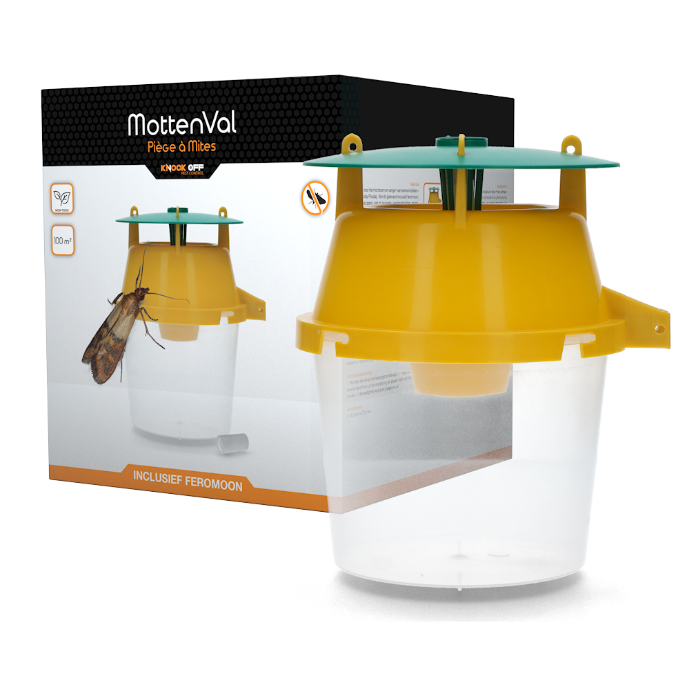Knock Off Mottenval. Zeer solide val voor het monitoren en vangen van levensmiddelenmotten (Ephestia/Plodia). Wordt geleverd inclusief feromoon. Ideale val om te gebruiken in keukens, voorraadkasten, magazijnen en winkels.