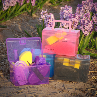 Mini poetsbox met een harde borstel, zachte borstel, rubber rosborstel, manenkam, hoevenkrabber en een spons.