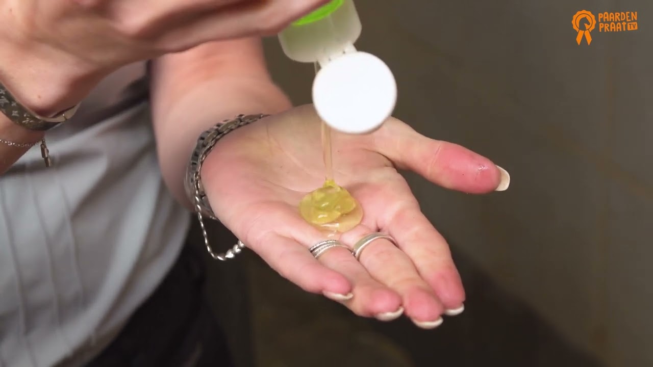Maak je paard nat op de plekken waar je je paard of pony wilt wassen, doe een beetje shampoo op je hand of op je borstel, en masseer goed in.