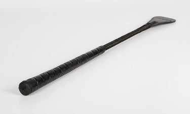 Luxe springstok met rubberen golfclub handvat, fijn gevlochten stok en een zwart lederen brede "driehoek" flapper (dicht).