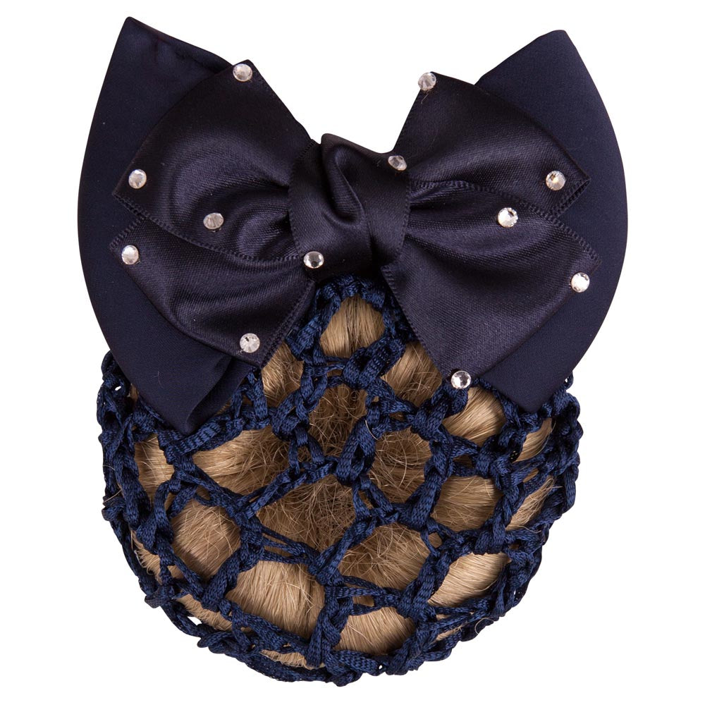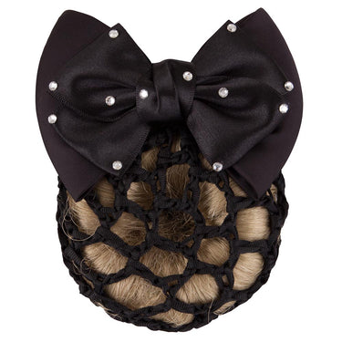 Knotnet met haarclip en strik. De knotnet heeft grote mazen. Op de kleine haarstrik zitten imitatie diamanten.