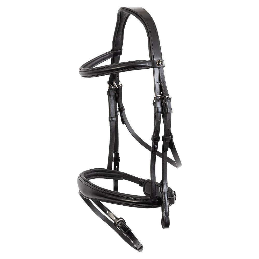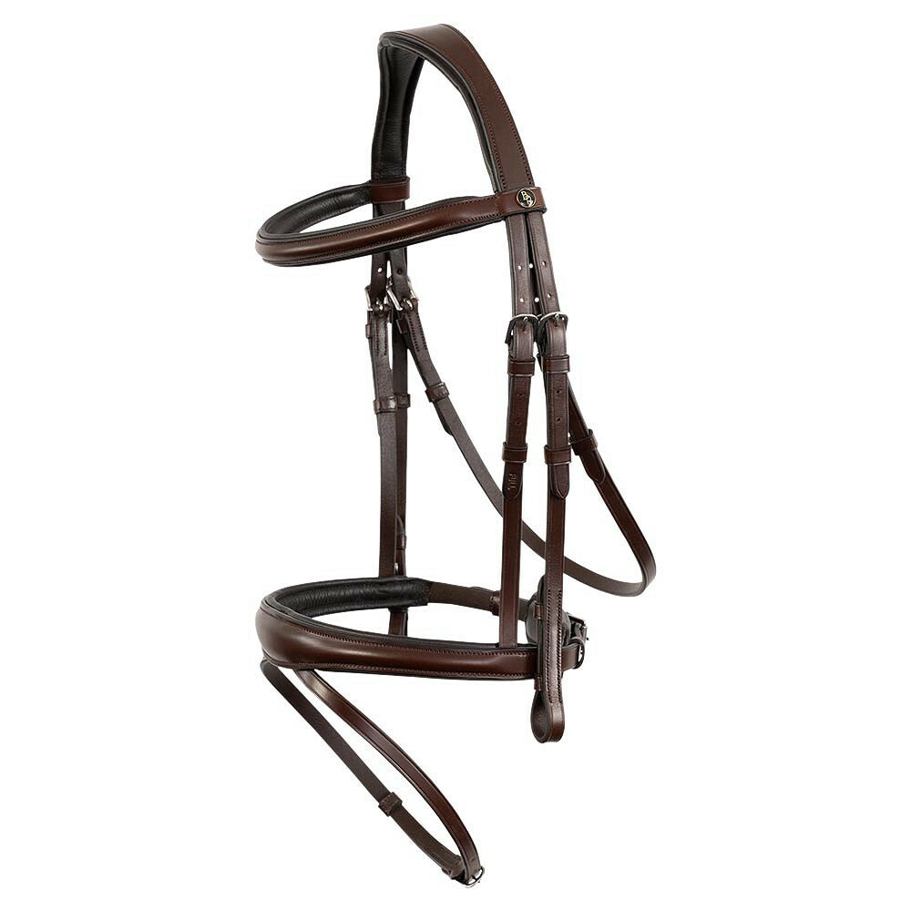 Bijzonder aan dit hoofdstel is de sperriem, die deels verborgen zit in de voorkant van de neusriem. Samen met het rechte frondeel maakt dit het hoofdstel stijlvol en klassiek. Dit heerlijk zachte en flexibele hoofdstel is daarnaast voorzien van een gespbeschermer bij de sperriem en een kaakbeschermer.