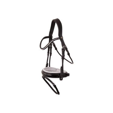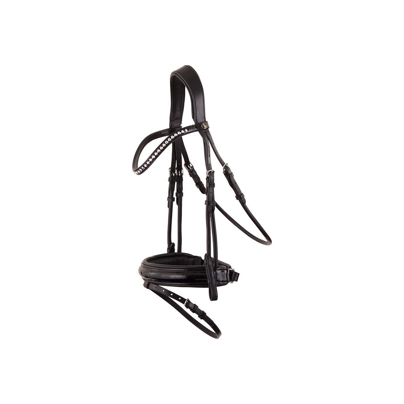Symmetrisch hoofdstel met anatomisch gevormd kopstuk. Het kopstuk is heerlijk zacht gevoerd. Het gebogen, laklederen frondeel is ingelegd met Oostenrijkse kristallen en met zacht leder onderlegd. De extra brede, gecombineerde aansnoerneusriem (circa 4.5 cm) met lakleder is rond gebombeerd, zacht gevoerd en voorzien van een brede, zacht gevoerde kaakbeschermer. Het hoofdstel is voorzien van een V-vormige sperriemlus en blinde sluitingen. Neusriem, keelriem en bakstukken zijn van rondgenaaid leder. Het hoofdstel is voorzien van ronde, glanzende, zilverkleurige fournituren. Exclusief teugel.