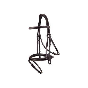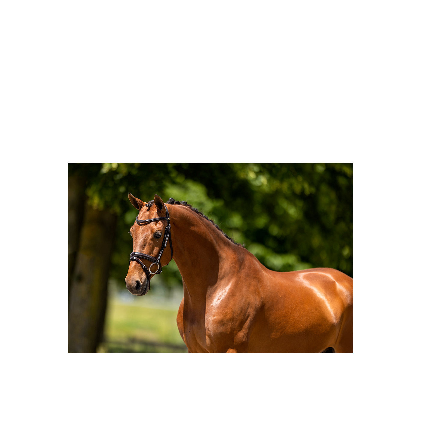 Dit symmetrische hoofdstel van hoogwaardig Europees leder heeft een E-Line kopstuk. Dit anatomisch gevormde kopstuk is zacht gevoerd en zorgt dankzij zijn ronde vorm voor extra vrijheid achter de oren van het paard. Het rechte frondeel is rond gebombeerd, zacht gevoerd en afgewerkt met contraststiksel. De keelriem is verstelbaar met ŽŽn gespsluiting aan de onderzijde. De gespsluiting is voorzien van een extra beschermflap. De bakstukken zijn voorzien van blinde sluitingen. Het hoofdstel heeft een gecombineerde neusriem (circa 2,7 cm) die verfraaid is met contraststiksel. Deze neusriem is rond gebombeerd en zacht gevoerd. Zowel de sperriem als de sperriemlus zijn afneembaar. Op deze manier kan het hoofdstel eenvoudig aangepast worden naar een model met een enkele neusriem. De gesp van de sperriem heeft een extra beschermflap. Het hoofdstel is uitgerust met glanzende, zilverkleurige fournituren van verchroomd messing. Exclusief teugels.