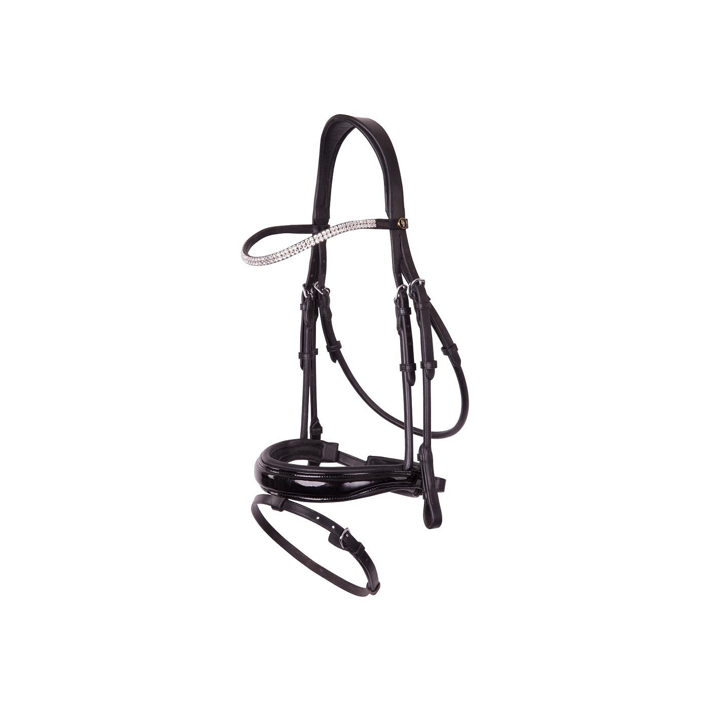 Dit symmetrische hoofdstel van hoogwaardig Europees leder heeft een E-Line kopstuk. Dit anatomisch gevormde kopstuk is zacht gevoerd en zorgt dankzij zijn ronde vorm voor extra vrijheid achter de oren van het paard. Het frondeel is voorzien van twee rijen grote Oostenrijkse kristallen en onderlegd met zacht leder. De keelriem is aan beide zijden verstelbaar. Zowel de keelriem als de bakstukken zijn vervaardigd van rondgenaaid leder. De bakstukken zijn voorzien van blinde sluitingen. Het hoofdstel heeft een brede, gecombineerde aansnoerneusriem (circa 4 cm) met lakleder. De neusriem is rond gebombeerd, zacht gevoerd en voorzien van een brede, zacht gevoerde kaakbeschermer. Dankzij de anatomische vorm wordt meer ruimte gecre‘erd voor de bitringen. Het hoofdstel heeft een V-vormige sperriemlus en de gesp van de sperriem heeft een extra beschermflap. Het hoofdstel is uitgerust met glanzende, zilverkleurige fournituren van verchroomd messing. Exclusief teugels.