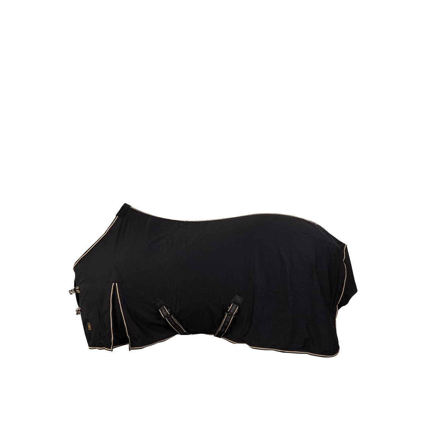 Deze anatomisch gevormde deken is vervaardigd van sterk polykatoen (65% katoen, 35% polyester). Bij de borst is de deken verstevigd met een extra laag polykatoen. De deken is voorzien van een verstelbare, dubbele borstsluiting met quick release clips en klittenband. Daarnaast heeft de deken een dubbelgestikte rugnaad met een bies en een fleece schoftbeschermer. De buiksingel is extra verstevigd dankzij de Pu patch van synthetisch leder. Verder is de deken voorzien van loopsplitten; kruissingels met elastiek die zowel verstelbaar als afneembaar zijn en verstelbare, afneembare, elastische bilkoorden. De deken is uitgerust met fournituren van zink met een matte, zilverkleurige finish. Machinewasbaar op 30¡C.