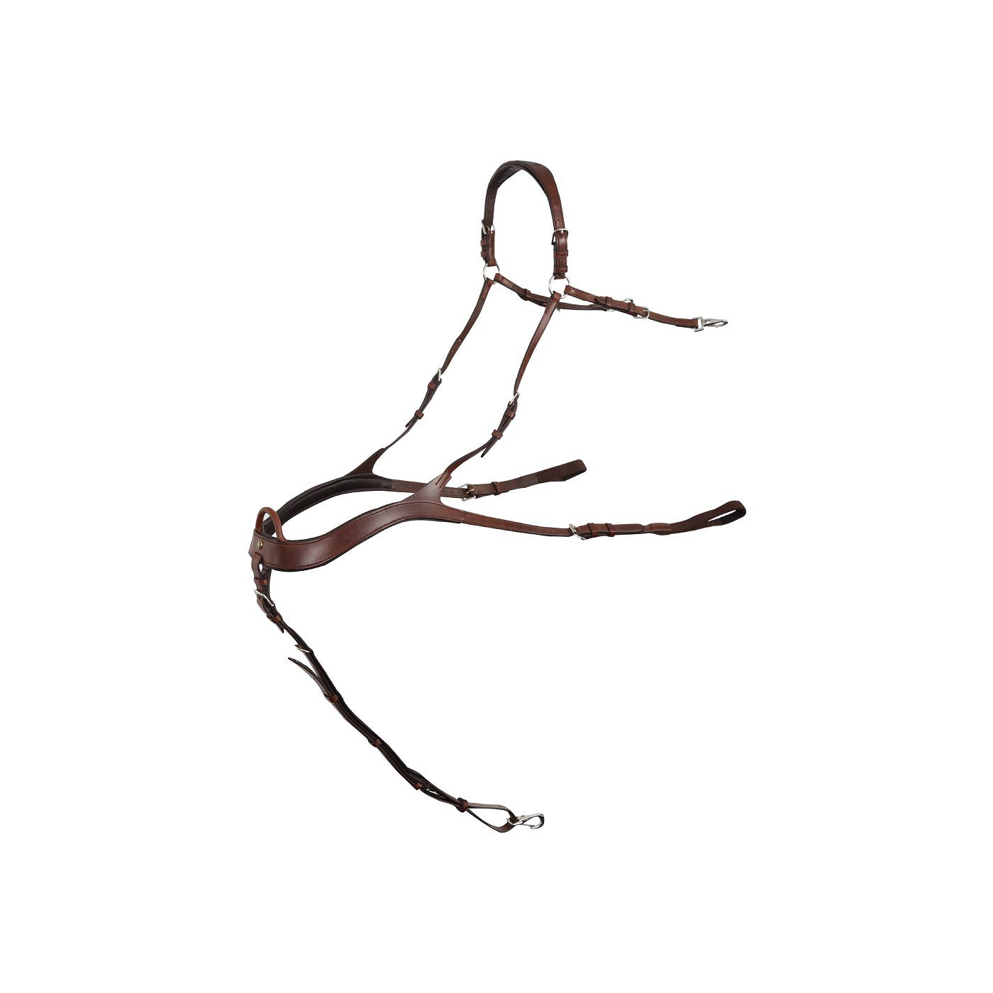 Dit vijfpunts voortuig is vervaardigd van hoogwaardig Europees leder en duurzaam elastiek. Het voortuig heeft een afneembare en verstelbare singellus met een afneembare karabijnhaak voor bevestiging aan de singel. Het voortuig wordt met verstelbare lederen riemen met gespsluiting bevestigd aan de singelstoten, de singelbevestigingen zijn van elastiek. Tevens heeft het voortuig verstelbare lederen riemen met karabijnhaken voor bevestiging aan de D-ringen aan de voorzijde van het zadel. De meeste delen van het voortuig zijn zacht gevoerd. Het voortuig is uitgerust met glanzende, zilverkleurige fournituren van verchroomd messing. Het voortuig voorkomt dat het zadel naar achteren schuift, vooral bij springen/eventing of bij hele ronde paarden waarbij het zadel vlug schuift kan dit nuttig zijn. Het voortuig wordt zonder vork geleverd. Passend bij de BR martingaalvork, artikel 239021, 239010 en 239012.