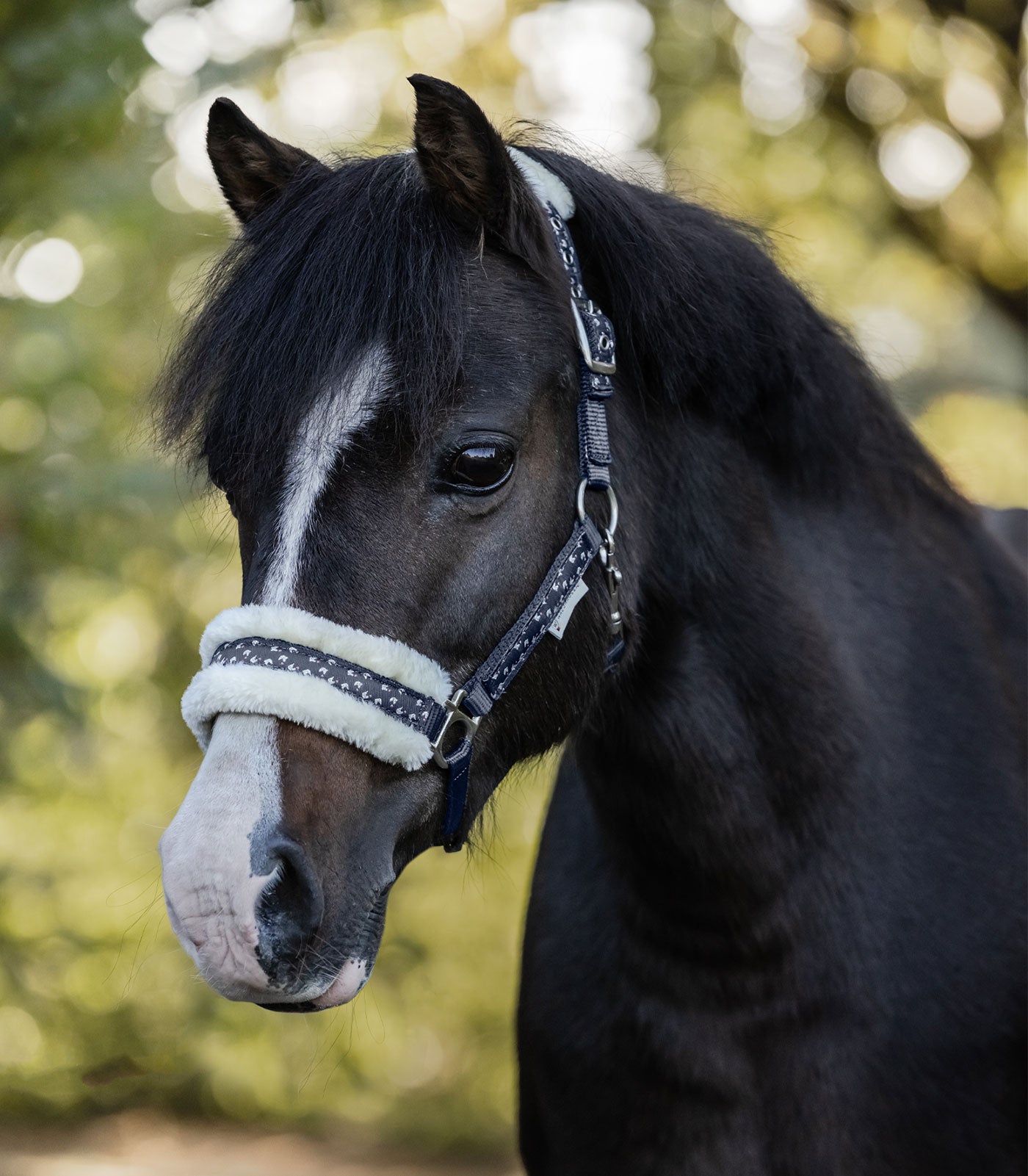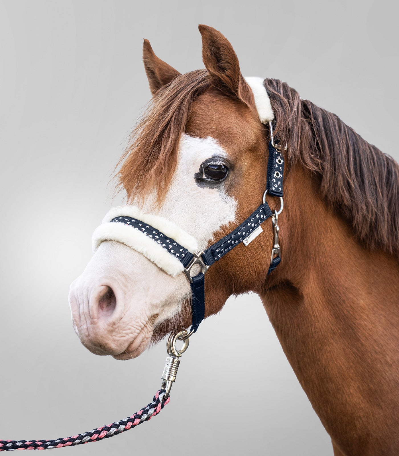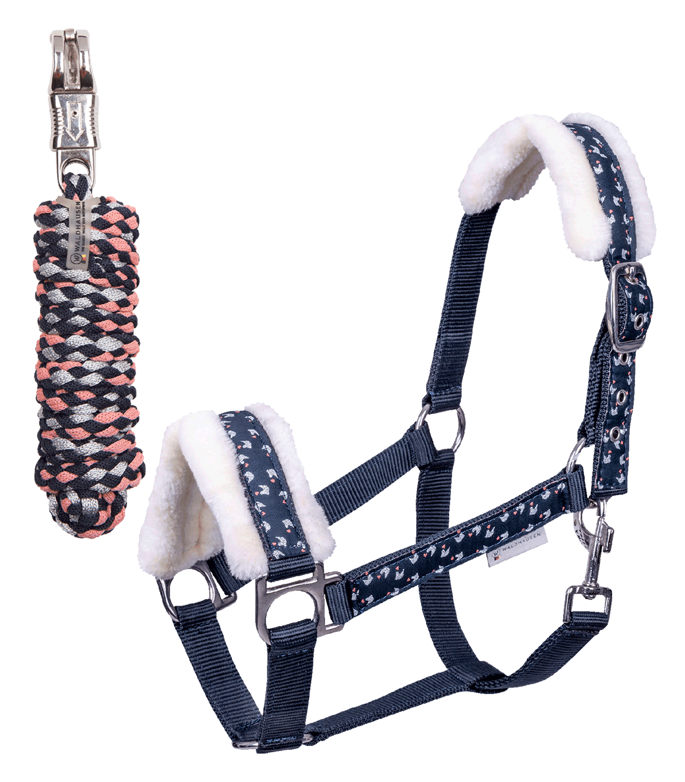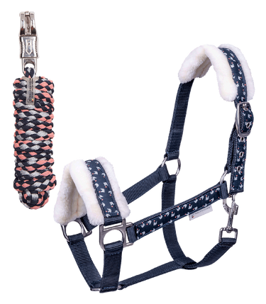 Set consisting in halter of cute all-over print and tricolour lead rope. The halter is padded with fur in the nose and neck area.