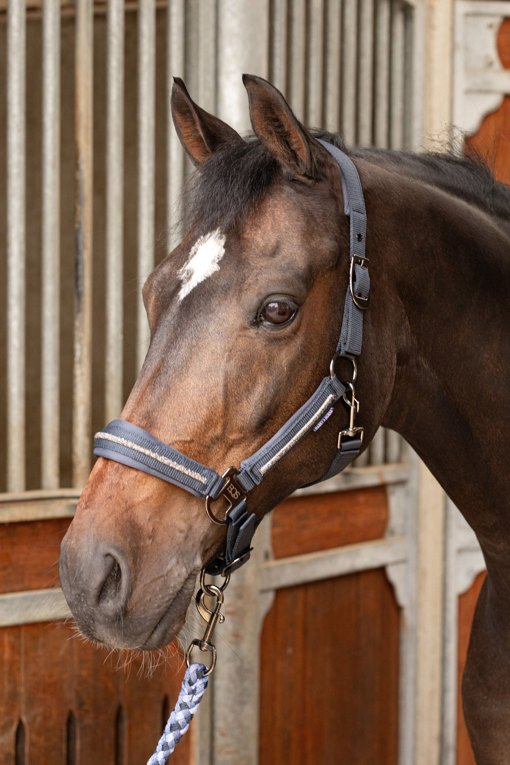 Halster welke sierlijk is afgewerkt met kristallen op de neusriem en de bakstukken, met neopreen onderlegd. Verstelbaar op de neusriem en het kopstuk is aan beide zijden verstelbaar. Met een bijpassend halstertouw van 2 meter lengte.