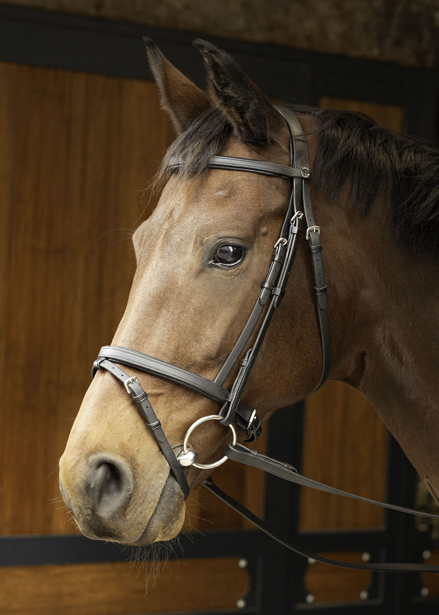 Kunstlederen hoofdstel met gecombineerde neusriem. Vanwege het kunststof materiaal bijzonder makkelijk in onderhoud. Het kopstuk en de neusriem zijn voorzien van zachte kunstleder padding, lusjes en andere details zijn tevens van kunstleder.
